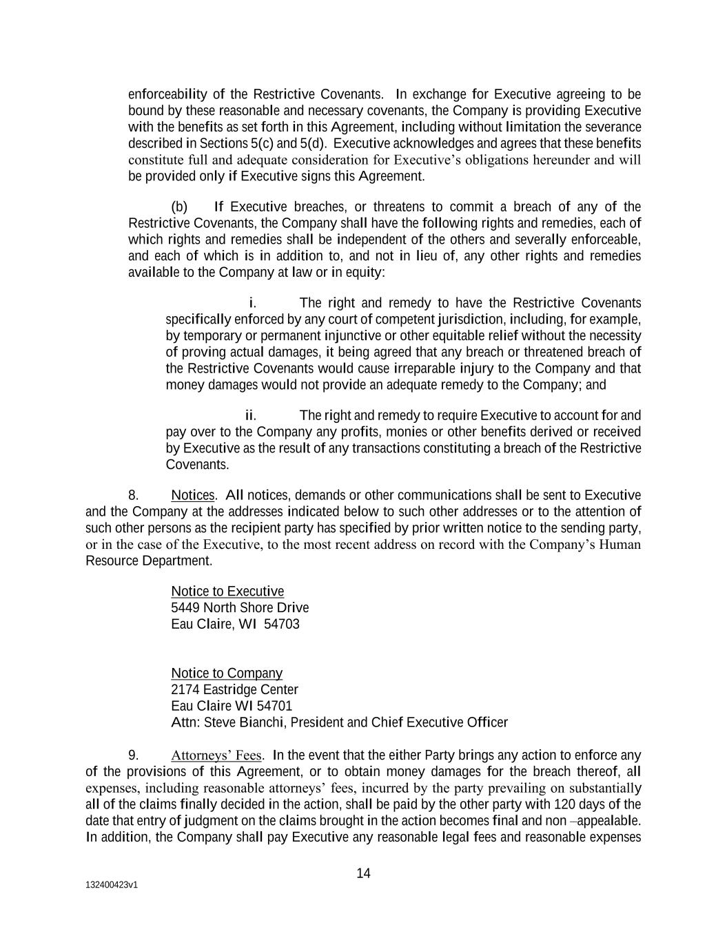 132400423v1 14 enforceability of the Restrictive Covenants. In exchange for Executive agreeing to be bound by these reasonable and necessary covenants, the Company is providing Executive with the benefits as set forth in this Agreement, including without limitation the severance described in Sections 5(c) and 5(d). Executive acknowledges and agrees that these benefits constitute full and adequate consideration for Executive’s obligations hereunder and will be provided only if Executive signs this Agreement. (b) If Executive breaches, or threatens to commit a breach of any of the Restrictive Covenants, the Company shall have the following rights and remedies, each of which rights and remedies shall be independent of the others and severally enforceable, and each of which is in addition to, and not in lieu of, any other rights and remedies available to the Company at law or in equity: i. The right and remedy to have the Restrictive Covenants specifically enforced by any court of competent jurisdiction, including, for example, by temporary or permanent injunctive or other equitable relief without the necessity of proving actual damages, it being agreed that any breach or threatened breach of the Restrictive Covenants would cause irreparable injury to the Company and that money damages would not provide an adequate remedy to the Company; and ii. The right and remedy to require Executive to account for and pay over to the Company any profits, monies or other benefits derived or received by Executive as the result of any transactions constituting a breach of the Restrictive Covenants. 8. Notices. All notices, demands or other communications shall be sent to Executive and the Company at the addresses indicated below to such other addresses or to the attention of such other persons as the recipient party has specified by prior written notice to the sending party, or in the case of the Executive, to the most recent address on record with the Company’s Human Resource Department. Notice to Executive 5449 North Shore Drive Eau Claire, WI 54703 Notice to Company 2174 Eastridge Center Eau Claire WI 54701 Attn: Steve Bianchi, President and Chief Executive Officer 9. Attorneys’ Fees. In the event that the either Party brings any action to enforce any of the provisions of this Agreement, or to obtain money damages for the breach thereof, all expenses, including reasonable attorneys’ fees, incurred by the party prevailing on substantially all of the claims finally decided in the action, shall be paid by the other party with 120 days of the date that entry of judgment on the claims brought in the action becomes final and non –appealable. In addition, the Company shall pay Executive any reasonable legal fees and reasonable expenses