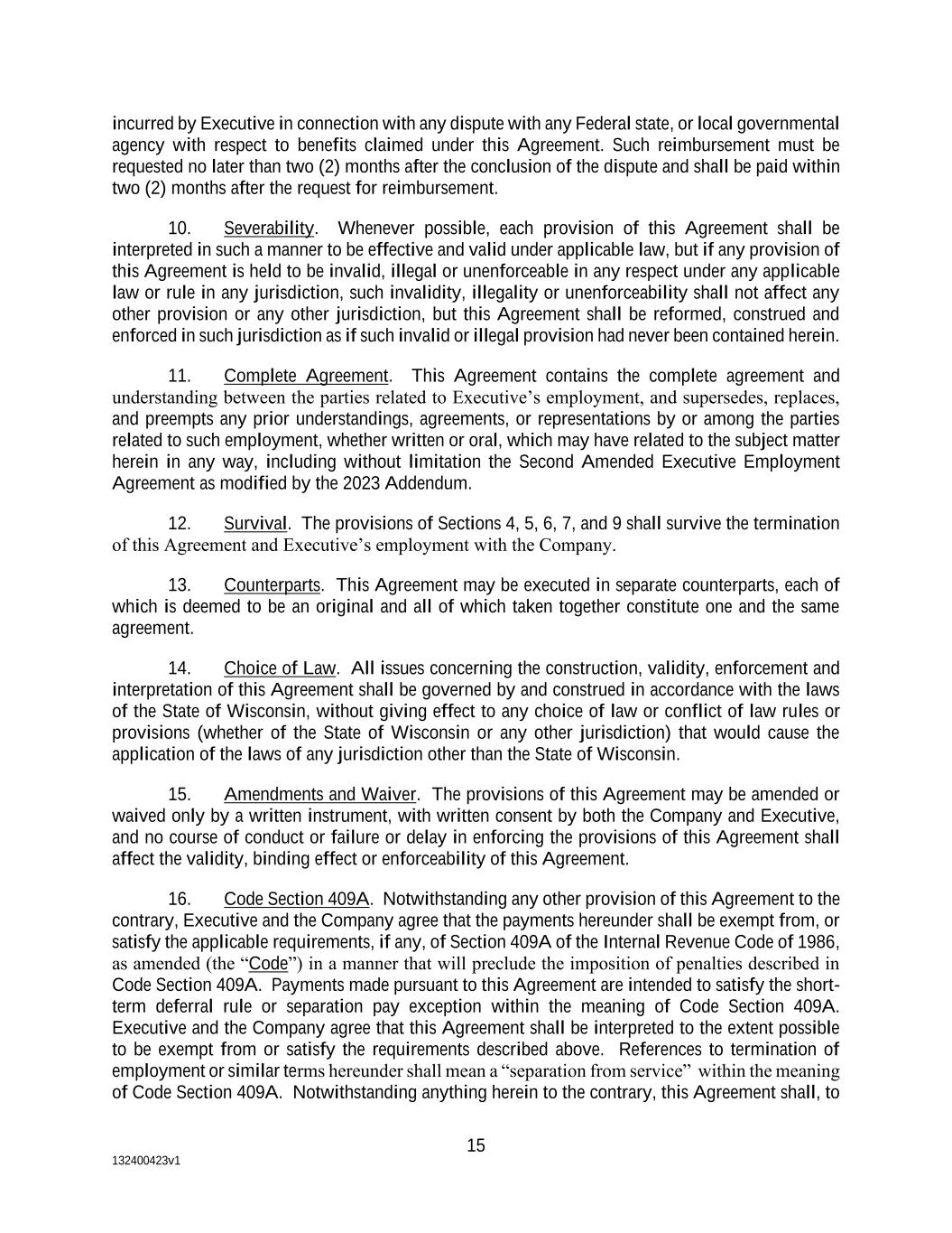 132400423v1 15 incurred by Executive in connection with any dispute with any Federal state, or local governmental agency with respect to benefits claimed under this Agreement. Such reimbursement must be requested no later than two (2) months after the conclusion of the dispute and shall be paid within two (2) months after the request for reimbursement. 10. Severability. Whenever possible, each provision of this Agreement shall be interpreted in such a manner to be effective and valid under applicable law, but if any provision of this Agreement is held to be invalid, illegal or unenforceable in any respect under any applicable law or rule in any jurisdiction, such invalidity, illegality or unenforceability shall not affect any other provision or any other jurisdiction, but this Agreement shall be reformed, construed and enforced in such jurisdiction as if such invalid or illegal provision had never been contained herein. 11. Complete Agreement. This Agreement contains the complete agreement and understanding between the parties related to Executive’s employment, and supersedes, replaces, and preempts any prior understandings, agreements, or representations by or among the parties related to such employment, whether written or oral, which may have related to the subject matter herein in any way, including without limitation the Second Amended Executive Employment Agreement as modified by the 2023 Addendum. 12. Survival. The provisions of Sections 4, 5, 6, 7, and 9 shall survive the termination of this Agreement and Executive’s employment with the Company. 13. Counterparts. This Agreement may be executed in separate counterparts, each of which is deemed to be an original and all of which taken together constitute one and the same agreement. 14. Choice of Law. All issues concerning the construction, validity, enforcement and interpretation of this Agreement shall be governed by and construed in accordance with the laws of the State of Wisconsin, without giving effect to any choice of law or conflict of law rules or provisions (whether of the State of Wisconsin or any other jurisdiction) that would cause the application of the laws of any jurisdiction other than the State of Wisconsin. 15. Amendments and Waiver. The provisions of this Agreement may be amended or waived only by a written instrument, with written consent by both the Company and Executive, and no course of conduct or failure or delay in enforcing the provisions of this Agreement shall affect the validity, binding effect or enforceability of this Agreement. 16. Code Section 409A. Notwithstanding any other provision of this Agreement to the contrary, Executive and the Company agree that the payments hereunder shall be exempt from, or satisfy the applicable requirements, if any, of Section 409A of the Internal Revenue Code of 1986, as amended (the “Code”) in a manner that will preclude the imposition of penalties described in Code Section 409A. Payments made pursuant to this Agreement are intended to satisfy the short- term deferral rule or separation pay exception within the meaning of Code Section 409A. Executive and the Company agree that this Agreement shall be interpreted to the extent possible to be exempt from or satisfy the requirements described above. References to termination of employment or similar terms hereunder shall mean a “separation from service” within the meaning of Code Section 409A. Notwithstanding anything herein to the contrary, this Agreement shall, to