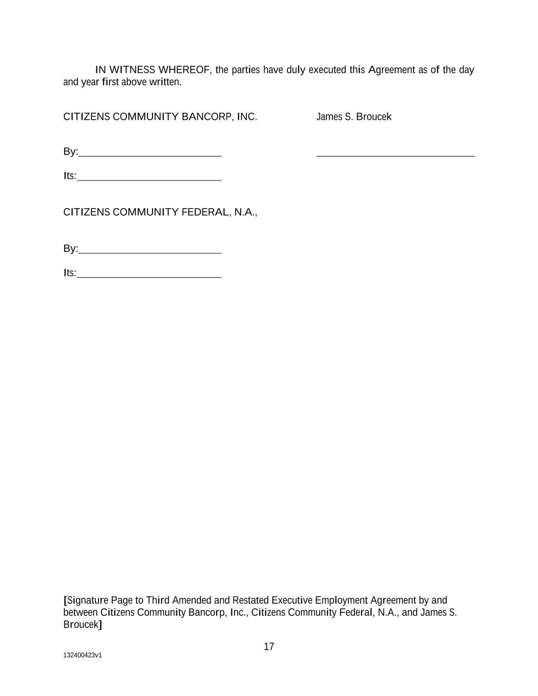 132400423v1 17 IN WITNESS WHEREOF, the parties have duly executed this Agreement as of the day and year first above written. CITIZENS COMMUNITY BANCORP, INC. James S. Broucek By: Its: CITIZENS COMMUNITY FEDERAL, N.A., By: Its: [Signature Page to Third Amended and Restated Executive Employment Agreement by and between Citizens Community Bancorp, Inc., Citizens Community Federal, N.A., and James S. Broucek]