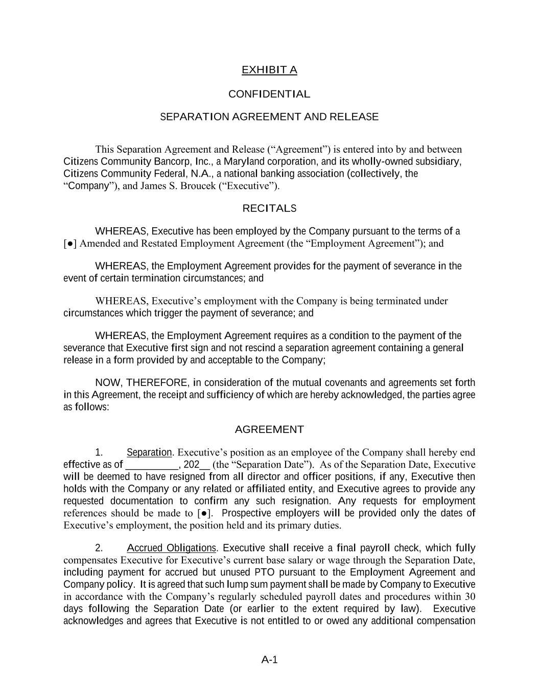 A-1 EXHIBIT A CONFIDENTIAL SEPARATION AGREEMENT AND RELEASE This Separation Agreement and Release (“Agreement”) is entered into by and between Citizens Community Bancorp, Inc., a Maryland corporation, and its wholly-owned subsidiary, Citizens Community Federal, N.A., a national banking association (collectively, the “Company”), and James S. Broucek (“Executive”). RECITALS WHEREAS, Executive has been employed by the Company pursuant to the terms of a [●] Amended and Restated Employment Agreement (the “Employment Agreement”); and WHEREAS, the Employment Agreement provides for the payment of severance in the event of certain termination circumstances; and WHEREAS, Executive’s employment with the Company is being terminated under circumstances which trigger the payment of severance; and WHEREAS, the Employment Agreement requires as a condition to the payment of the severance that Executive first sign and not rescind a separation agreement containing a general release in a form provided by and acceptable to the Company; NOW, THEREFORE, in consideration of the mutual covenants and agreements set forth in this Agreement, the receipt and sufficiency of which are hereby acknowledged, the parties agree as follows: AGREEMENT 1. Separation. Executive’s position as an employee of the Company shall hereby end effective as of __________, 202__ (the “Separation Date”). As of the Separation Date, Executive will be deemed to have resigned from all director and officer positions, if any, Executive then holds with the Company or any related or affiliated entity, and Executive agrees to provide any requested documentation to confirm any such resignation. Any requests for employment references should be made to [●]. Prospective employers will be provided only the dates of Executive’s employment, the position held and its primary duties. 2. Accrued Obligations. Executive shall receive a final payroll check, which fully compensates Executive for Executive’s current base salary or wage through the Separation Date, including payment for accrued but unused PTO pursuant to the Employment Agreement and Company policy. It is agreed that such lump sum payment shall be made by Company to Executive in accordance with the Company’s regularly scheduled payroll dates and procedures within 30 days following the Separation Date (or earlier to the extent required by law). Executive acknowledges and agrees that Executive is not entitled to or owed any additional compensation