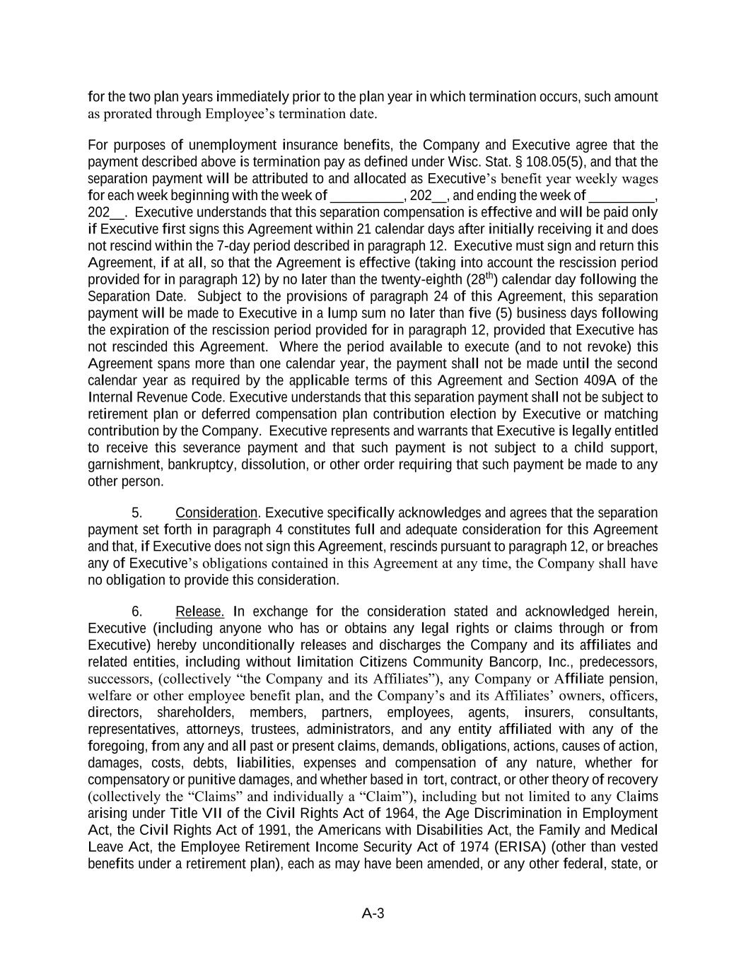 A-3 for the two plan years immediately prior to the plan year in which termination occurs, such amount as prorated through Employee’s termination date. For purposes of unemployment insurance benefits, the Company and Executive agree that the payment described above is termination pay as defined under Wisc. Stat. § 108.05(5), and that the separation payment will be attributed to and allocated as Executive’s benefit year weekly wages for each week beginning with the week of __________, 202__, and ending the week of _________, 202__. Executive understands that this separation compensation is effective and will be paid only if Executive first signs this Agreement within 21 calendar days after initially receiving it and does not rescind within the 7-day period described in paragraph 12. Executive must sign and return this Agreement, if at all, so that the Agreement is effective (taking into account the rescission period provided for in paragraph 12) by no later than the twenty-eighth (28th) calendar day following the Separation Date. Subject to the provisions of paragraph 24 of this Agreement, this separation payment will be made to Executive in a lump sum no later than five (5) business days following the expiration of the rescission period provided for in paragraph 12, provided that Executive has not rescinded this Agreement. Where the period available to execute (and to not revoke) this Agreement spans more than one calendar year, the payment shall not be made until the second calendar year as required by the applicable terms of this Agreement and Section 409A of the Internal Revenue Code. Executive understands that this separation payment shall not be subject to retirement plan or deferred compensation plan contribution election by Executive or matching contribution by the Company. Executive represents and warrants that Executive is legally entitled to receive this severance payment and that such payment is not subject to a child support, garnishment, bankruptcy, dissolution, or other order requiring that such payment be made to any other person. 5. Consideration. Executive specifically acknowledges and agrees that the separation payment set forth in paragraph 4 constitutes full and adequate consideration for this Agreement and that, if Executive does not sign this Agreement, rescinds pursuant to paragraph 12, or breaches any of Executive’s obligations contained in this Agreement at any time, the Company shall have no obligation to provide this consideration. 6. Release. In exchange for the consideration stated and acknowledged herein, Executive (including anyone who has or obtains any legal rights or claims through or from Executive) hereby unconditionally releases and discharges the Company and its affiliates and related entities, including without limitation Citizens Community Bancorp, Inc., predecessors, successors, (collectively “the Company and its Affiliates”), any Company or Affiliate pension, welfare or other employee benefit plan, and the Company’s and its Affiliates’ owners, officers, directors, shareholders, members, partners, employees, agents, insurers, consultants, representatives, attorneys, trustees, administrators, and any entity affiliated with any of the foregoing, from any and all past or present claims, demands, obligations, actions, causes of action, damages, costs, debts, liabilities, expenses and compensation of any nature, whether for compensatory or punitive damages, and whether based in tort, contract, or other theory of recovery (collectively the “Claims” and individually a “Claim”), including but not limited to any Claims arising under Title VII of the Civil Rights Act of 1964, the Age Discrimination in Employment Act, the Civil Rights Act of 1991, the Americans with Disabilities Act, the Family and Medical Leave Act, the Employee Retirement Income Security Act of 1974 (ERISA) (other than vested benefits under a retirement plan), each as may have been amended, or any other federal, state, or