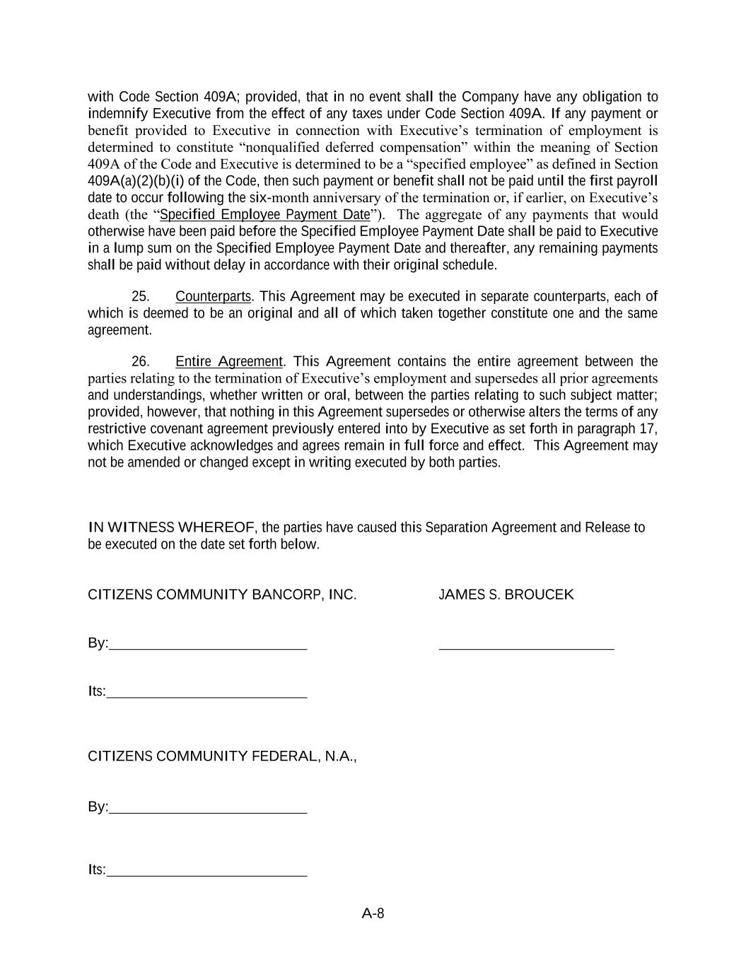 A-8 with Code Section 409A; provided, that in no event shall the Company have any obligation to indemnify Executive from the effect of any taxes under Code Section 409A. If any payment or benefit provided to Executive in connection with Executive’s termination of employment is determined to constitute “nonqualified deferred compensation” within the meaning of Section 409A of the Code and Executive is determined to be a “specified employee” as defined in Section 409A(a)(2)(b)(i) of the Code, then such payment or benefit shall not be paid until the first payroll date to occur following the six-month anniversary of the termination or, if earlier, on Executive’s death (the “Specified Employee Payment Date”). The aggregate of any payments that would otherwise have been paid before the Specified Employee Payment Date shall be paid to Executive in a lump sum on the Specified Employee Payment Date and thereafter, any remaining payments shall be paid without delay in accordance with their original schedule. 25. Counterparts. This Agreement may be executed in separate counterparts, each of which is deemed to be an original and all of which taken together constitute one and the same agreement. 26. Entire Agreement. This Agreement contains the entire agreement between the parties relating to the termination of Executive’s employment and supersedes all prior agreements and understandings, whether written or oral, between the parties relating to such subject matter; provided, however, that nothing in this Agreement supersedes or otherwise alters the terms of any restrictive covenant agreement previously entered into by Executive as set forth in paragraph 17, which Executive acknowledges and agrees remain in full force and effect. This Agreement may not be amended or changed except in writing executed by both parties. IN WITNESS WHEREOF, the parties have caused this Separation Agreement and Release to be executed on the date set forth below. CITIZENS COMMUNITY BANCORP, INC. JAMES S. BROUCEK By: Its: CITIZENS COMMUNITY FEDERAL, N.A., By: Its: