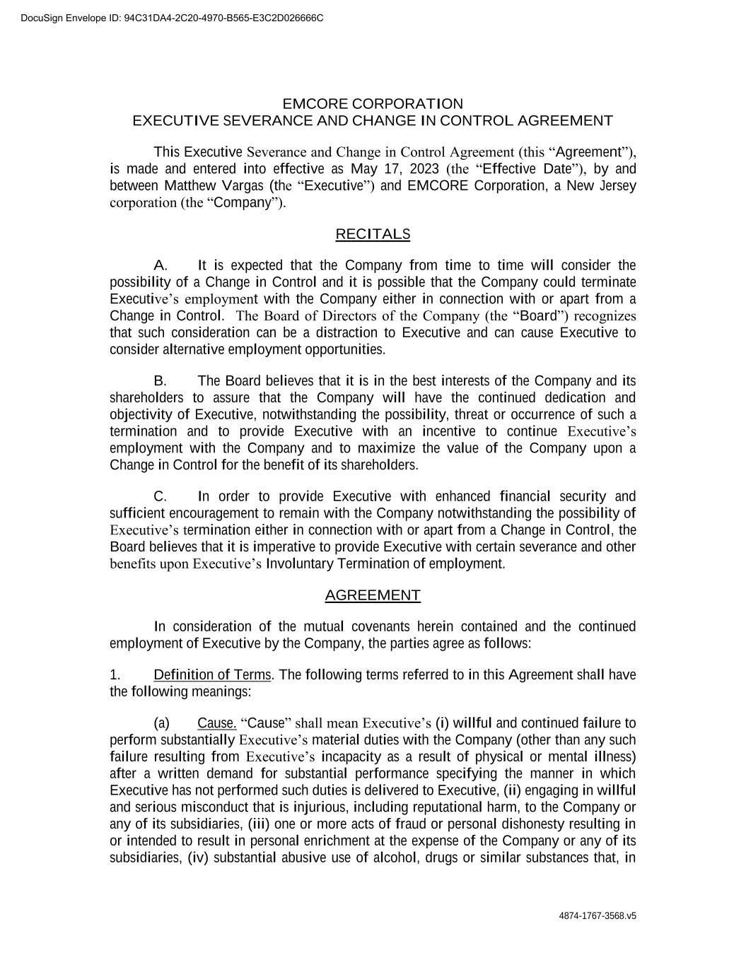 4874-1767-3568.v5 EMCORE CORPORATION EXECUTIVE SEVERANCE AND CHANGE IN CONTROL AGREEMENT This Executive Severance and Change in Control Agreement (this “Agreement”), is made and entered into effective as May 17, 2023 (the “Effective Date”), by and between Matthew Vargas (the “Executive”) and EMCORE Corporation, a New Jersey corporation (the “Company”). RECITALS A. It is expected that the Company from time to time will consider the possibility of a Change in Control and it is possible that the Company could terminate Executive’s employment with the Company either in connection with or apart from a Change in Control. The Board of Directors of the Company (the “Board”) recognizes that such consideration can be a distraction to Executive and can cause Executive to consider alternative employment opportunities. B. The Board believes that it is in the best interests of the Company and its shareholders to assure that the Company will have the continued dedication and objectivity of Executive, notwithstanding the possibility, threat or occurrence of such a termination and to provide Executive with an incentive to continue Executive’s employment with the Company and to maximize the value of the Company upon a Change in Control for the benefit of its shareholders. C. In order to provide Executive with enhanced financial security and sufficient encouragement to remain with the Company notwithstanding the possibility of Executive’s termination either in connection with or apart from a Change in Control, the Board believes that it is imperative to provide Executive with certain severance and other benefits upon Executive’s Involuntary Termination of employment. AGREEMENT In consideration of the mutual covenants herein contained and the continued employment of Executive by the Company, the parties agree as follows: 1. Definition of Terms. The following terms referred to in this Agreement shall have the following meanings: (a) Cause. “Cause” shall mean Executive’s (i) willful and continued failure to perform substantially Executive’s material duties with the Company (other than any such failure resulting from Executive’s incapacity as a result of physical or mental illness) after a written demand for substantial performance specifying the manner in which Executive has not performed such duties is delivered to Executive, (ii) engaging in willful and serious misconduct that is injurious, including reputational harm, to the Company or any of its subsidiaries, (iii) one or more acts of fraud or personal dishonesty resulting in or intended to result in personal enrichment at the expense of the Company or any of its subsidiaries, (iv) substantial abusive use of alcohol, drugs or similar substances that, in DocuSign Envelope ID: 94C31DA4-2C20-4970-B565-E3C2D026666C