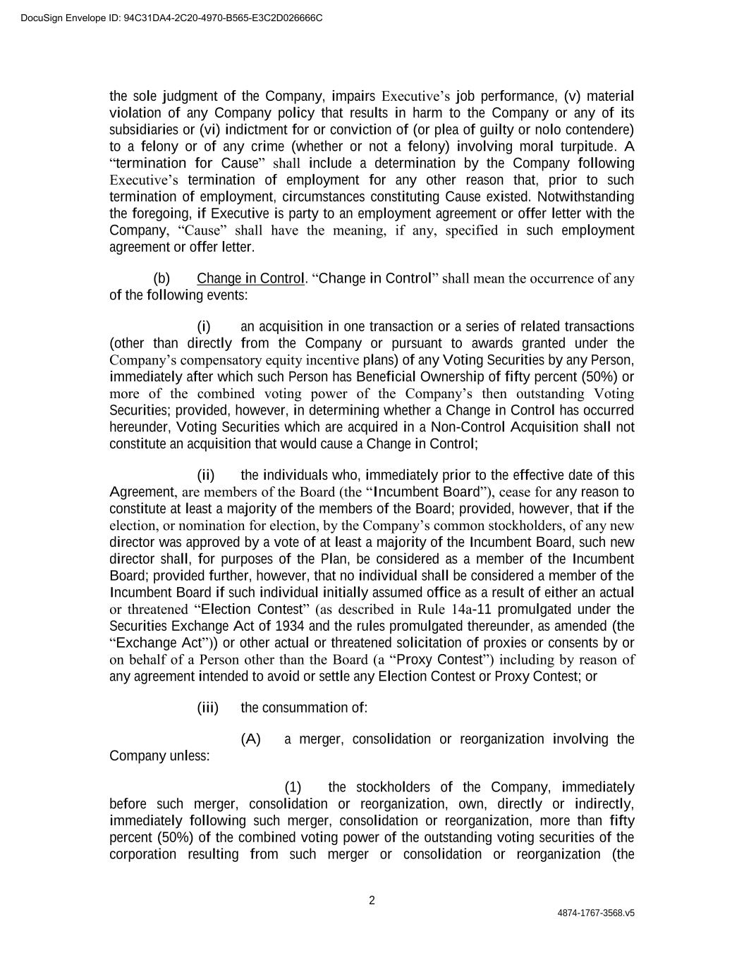 2 4874-1767-3568.v5 the sole judgment of the Company, impairs Executive’s job performance, (v) material violation of any Company policy that results in harm to the Company or any of its subsidiaries or (vi) indictment for or conviction of (or plea of guilty or nolo contendere) to a felony or of any crime (whether or not a felony) involving moral turpitude. A “termination for Cause” shall include a determination by the Company following Executive’s termination of employment for any other reason that, prior to such termination of employment, circumstances constituting Cause existed. Notwithstanding the foregoing, if Executive is party to an employment agreement or offer letter with the Company, “Cause” shall have the meaning, if any, specified in such employment agreement or offer letter. (b) Change in Control. “Change in Control” shall mean the occurrence of any of the following events: (i) an acquisition in one transaction or a series of related transactions (other than directly from the Company or pursuant to awards granted under the Company’s compensatory equity incentive plans) of any Voting Securities by any Person, immediately after which such Person has Beneficial Ownership of fifty percent (50%) or more of the combined voting power of the Company’s then outstanding Voting Securities; provided, however, in determining whether a Change in Control has occurred hereunder, Voting Securities which are acquired in a Non-Control Acquisition shall not constitute an acquisition that would cause a Change in Control; (ii) the individuals who, immediately prior to the effective date of this Agreement, are members of the Board (the “Incumbent Board”), cease for any reason to constitute at least a majority of the members of the Board; provided, however, that if the election, or nomination for election, by the Company’s common stockholders, of any new director was approved by a vote of at least a majority of the Incumbent Board, such new director shall, for purposes of the Plan, be considered as a member of the Incumbent Board; provided further, however, that no individual shall be considered a member of the Incumbent Board if such individual initially assumed office as a result of either an actual or threatened “Election Contest” (as described in Rule 14a-11 promulgated under the Securities Exchange Act of 1934 and the rules promulgated thereunder, as amended (the “Exchange Act”)) or other actual or threatened solicitation of proxies or consents by or on behalf of a Person other than the Board (a “Proxy Contest”) including by reason of any agreement intended to avoid or settle any Election Contest or Proxy Contest; or (iii) the consummation of: (A) a merger, consolidation or reorganization involving the Company unless: (1) the stockholders of the Company, immediately before such merger, consolidation or reorganization, own, directly or indirectly, immediately following such merger, consolidation or reorganization, more than fifty percent (50%) of the combined voting power of the outstanding voting securities of the corporation resulting from such merger or consolidation or reorganization (the DocuSign Envelope ID: 94C31DA4-2C20-4970-B565-E3C2D026666C