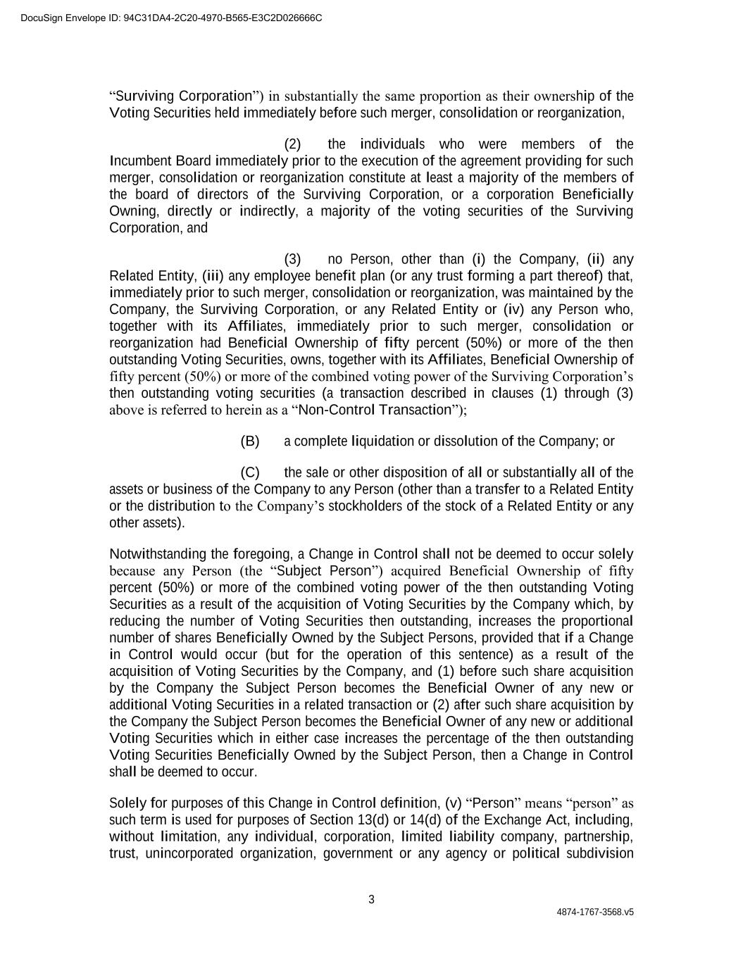 3 4874-1767-3568.v5 “Surviving Corporation”) in substantially the same proportion as their ownership of the Voting Securities held immediately before such merger, consolidation or reorganization, (2) the individuals who were members of the Incumbent Board immediately prior to the execution of the agreement providing for such merger, consolidation or reorganization constitute at least a majority of the members of the board of directors of the Surviving Corporation, or a corporation Beneficially Owning, directly or indirectly, a majority of the voting securities of the Surviving Corporation, and (3) no Person, other than (i) the Company, (ii) any Related Entity, (iii) any employee benefit plan (or any trust forming a part thereof) that, immediately prior to such merger, consolidation or reorganization, was maintained by the Company, the Surviving Corporation, or any Related Entity or (iv) any Person who, together with its Affiliates, immediately prior to such merger, consolidation or reorganization had Beneficial Ownership of fifty percent (50%) or more of the then outstanding Voting Securities, owns, together with its Affiliates, Beneficial Ownership of fifty percent (50%) or more of the combined voting power of the Surviving Corporation’s then outstanding voting securities (a transaction described in clauses (1) through (3) above is referred to herein as a “Non-Control Transaction”); (B) a complete liquidation or dissolution of the Company; or (C) the sale or other disposition of all or substantially all of the assets or business of the Company to any Person (other than a transfer to a Related Entity or the distribution to the Company’s stockholders of the stock of a Related Entity or any other assets). Notwithstanding the foregoing, a Change in Control shall not be deemed to occur solely because any Person (the “Subject Person”) acquired Beneficial Ownership of fifty percent (50%) or more of the combined voting power of the then outstanding Voting Securities as a result of the acquisition of Voting Securities by the Company which, by reducing the number of Voting Securities then outstanding, increases the proportional number of shares Beneficially Owned by the Subject Persons, provided that if a Change in Control would occur (but for the operation of this sentence) as a result of the acquisition of Voting Securities by the Company, and (1) before such share acquisition by the Company the Subject Person becomes the Beneficial Owner of any new or additional Voting Securities in a related transaction or (2) after such share acquisition by the Company the Subject Person becomes the Beneficial Owner of any new or additional Voting Securities which in either case increases the percentage of the then outstanding Voting Securities Beneficially Owned by the Subject Person, then a Change in Control shall be deemed to occur. Solely for purposes of this Change in Control definition, (v) “Person” means “person” as such term is used for purposes of Section 13(d) or 14(d) of the Exchange Act, including, without limitation, any individual, corporation, limited liability company, partnership, trust, unincorporated organization, government or any agency or political subdivision DocuSign Envelope ID: 94C31DA4-2C20-4970-B565-E3C2D026666C