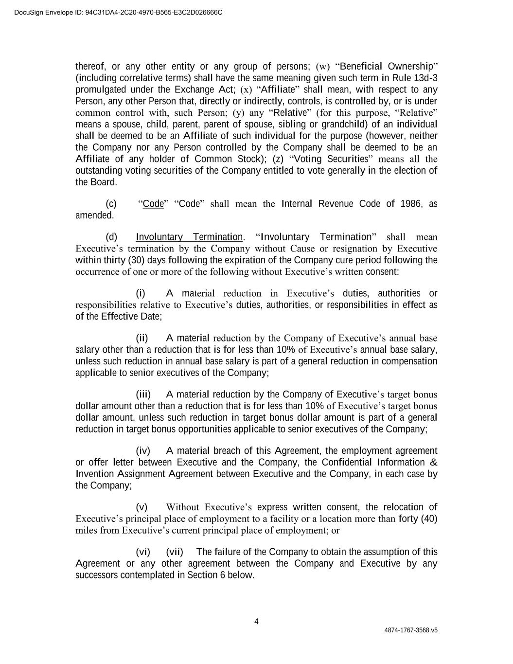4 4874-1767-3568.v5 thereof, or any other entity or any group of persons; (w) “Beneficial Ownership” (including correlative terms) shall have the same meaning given such term in Rule 13d-3 promulgated under the Exchange Act; (x) “Affiliate” shall mean, with respect to any Person, any other Person that, directly or indirectly, controls, is controlled by, or is under common control with, such Person; (y) any “Relative” (for this purpose, “Relative” means a spouse, child, parent, parent of spouse, sibling or grandchild) of an individual shall be deemed to be an Affiliate of such individual for the purpose (however, neither the Company nor any Person controlled by the Company shall be deemed to be an Affiliate of any holder of Common Stock); (z) “Voting Securities” means all the outstanding voting securities of the Company entitled to vote generally in the election of the Board. (c) “Code” “Code” shall mean the Internal Revenue Code of 1986, as amended. (d) Involuntary Termination. “Involuntary Termination” shall mean Executive’s termination by the Company without Cause or resignation by Executive within thirty (30) days following the expiration of the Company cure period following the occurrence of one or more of the following without Executive’s written consent: (i) A material reduction in Executive’s duties, authorities or responsibilities relative to Executive’s duties, authorities, or responsibilities in effect as of the Effective Date; (ii) A material reduction by the Company of Executive’s annual base salary other than a reduction that is for less than 10% of Executive’s annual base salary, unless such reduction in annual base salary is part of a general reduction in compensation applicable to senior executives of the Company; (iii) A material reduction by the Company of Executive’s target bonus dollar amount other than a reduction that is for less than 10% of Executive’s target bonus dollar amount, unless such reduction in target bonus dollar amount is part of a general reduction in target bonus opportunities applicable to senior executives of the Company; (iv) A material breach of this Agreement, the employment agreement or offer letter between Executive and the Company, the Confidential Information & Invention Assignment Agreement between Executive and the Company, in each case by the Company; (v) Without Executive’s express written consent, the relocation of Executive’s principal place of employment to a facility or a location more than forty (40) miles from Executive’s current principal place of employment; or (vi) (vii) The failure of the Company to obtain the assumption of this Agreement or any other agreement between the Company and Executive by any successors contemplated in Section 6 below. DocuSign Envelope ID: 94C31DA4-2C20-4970-B565-E3C2D026666C