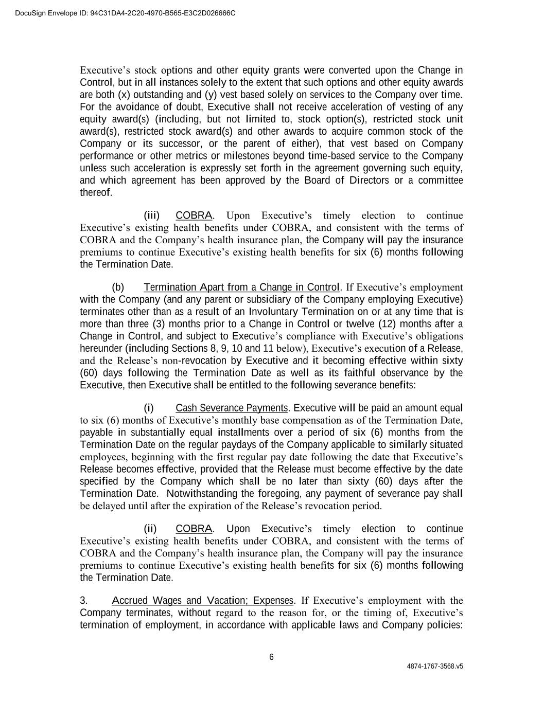 6 4874-1767-3568.v5 Executive’s stock options and other equity grants were converted upon the Change in Control, but in all instances solely to the extent that such options and other equity awards are both (x) outstanding and (y) vest based solely on services to the Company over time. For the avoidance of doubt, Executive shall not receive acceleration of vesting of any equity award(s) (including, but not limited to, stock option(s), restricted stock unit award(s), restricted stock award(s) and other awards to acquire common stock of the Company or its successor, or the parent of either), that vest based on Company performance or other metrics or milestones beyond time-based service to the Company unless such acceleration is expressly set forth in the agreement governing such equity, and which agreement has been approved by the Board of Directors or a committee thereof. (iii) COBRA. Upon Executive’s timely election to continue Executive’s existing health benefits under COBRA, and consistent with the terms of COBRA and the Company’s health insurance plan, the Company will pay the insurance premiums to continue Executive’s existing health benefits for six (6) months following the Termination Date. (b) Termination Apart from a Change in Control. If Executive’s employment with the Company (and any parent or subsidiary of the Company employing Executive) terminates other than as a result of an Involuntary Termination on or at any time that is more than three (3) months prior to a Change in Control or twelve (12) months after a Change in Control, and subject to Executive’s compliance with Executive’s obligations hereunder (including Sections 8, 9, 10 and 11 below), Executive’s execution of a Release, and the Release’s non-revocation by Executive and it becoming effective within sixty (60) days following the Termination Date as well as its faithful observance by the Executive, then Executive shall be entitled to the following severance benefits: (i) Cash Severance Payments. Executive will be paid an amount equal to six (6) months of Executive’s monthly base compensation as of the Termination Date, payable in substantially equal installments over a period of six (6) months from the Termination Date on the regular paydays of the Company applicable to similarly situated employees, beginning with the first regular pay date following the date that Executive’s Release becomes effective, provided that the Release must become effective by the date specified by the Company which shall be no later than sixty (60) days after the Termination Date. Notwithstanding the foregoing, any payment of severance pay shall be delayed until after the expiration of the Release’s revocation period. (ii) COBRA. Upon Executive’s timely election to continue Executive’s existing health benefits under COBRA, and consistent with the terms of COBRA and the Company’s health insurance plan, the Company will pay the insurance premiums to continue Executive’s existing health benefits for six (6) months following the Termination Date. 3. Accrued Wages and Vacation; Expenses. If Executive’s employment with the Company terminates, without regard to the reason for, or the timing of, Executive’s termination of employment, in accordance with applicable laws and Company policies: DocuSign Envelope ID: 94C31DA4-2C20-4970-B565-E3C2D026666C
