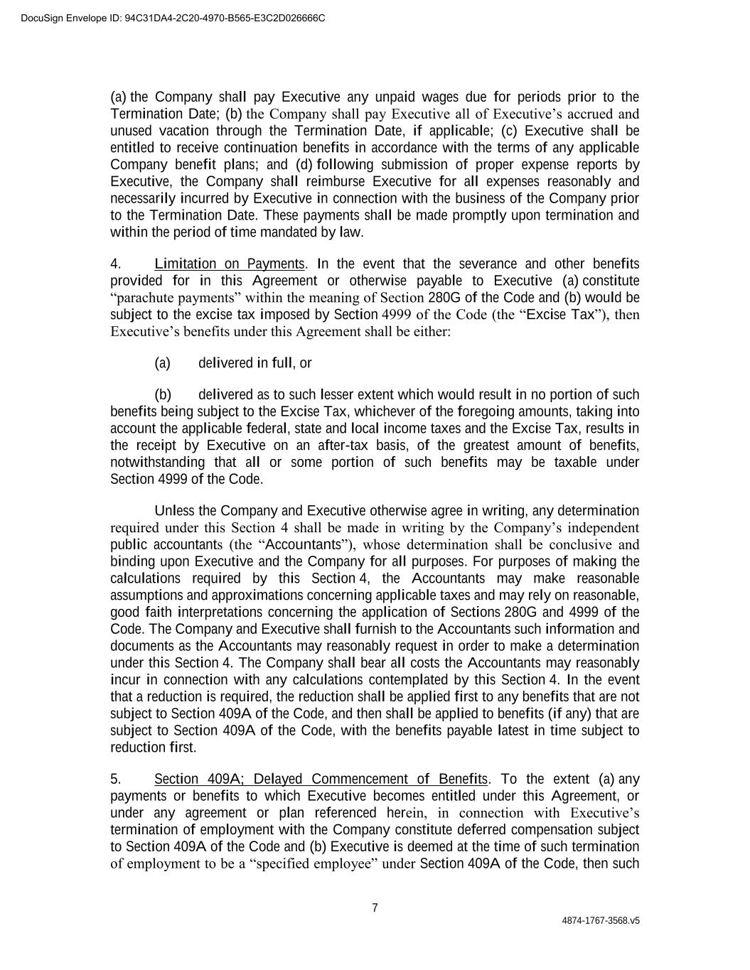 7 4874-1767-3568.v5 (a) the Company shall pay Executive any unpaid wages due for periods prior to the Termination Date; (b) the Company shall pay Executive all of Executive’s accrued and unused vacation through the Termination Date, if applicable; (c) Executive shall be entitled to receive continuation benefits in accordance with the terms of any applicable Company benefit plans; and (d) following submission of proper expense reports by Executive, the Company shall reimburse Executive for all expenses reasonably and necessarily incurred by Executive in connection with the business of the Company prior to the Termination Date. These payments shall be made promptly upon termination and within the period of time mandated by law. 4. Limitation on Payments. In the event that the severance and other benefits provided for in this Agreement or otherwise payable to Executive (a) constitute “parachute payments” within the meaning of Section 280G of the Code and (b) would be subject to the excise tax imposed by Section 4999 of the Code (the “Excise Tax”), then Executive’s benefits under this Agreement shall be either: (a) delivered in full, or (b) delivered as to such lesser extent which would result in no portion of such benefits being subject to the Excise Tax, whichever of the foregoing amounts, taking into account the applicable federal, state and local income taxes and the Excise Tax, results in the receipt by Executive on an after-tax basis, of the greatest amount of benefits, notwithstanding that all or some portion of such benefits may be taxable under Section 4999 of the Code. Unless the Company and Executive otherwise agree in writing, any determination required under this Section 4 shall be made in writing by the Company’s independent public accountants (the “Accountants”), whose determination shall be conclusive and binding upon Executive and the Company for all purposes. For purposes of making the calculations required by this Section 4, the Accountants may make reasonable assumptions and approximations concerning applicable taxes and may rely on reasonable, good faith interpretations concerning the application of Sections 280G and 4999 of the Code. The Company and Executive shall furnish to the Accountants such information and documents as the Accountants may reasonably request in order to make a determination under this Section 4. The Company shall bear all costs the Accountants may reasonably incur in connection with any calculations contemplated by this Section 4. In the event that a reduction is required, the reduction shall be applied first to any benefits that are not subject to Section 409A of the Code, and then shall be applied to benefits (if any) that are subject to Section 409A of the Code, with the benefits payable latest in time subject to reduction first. 5. Section 409A; Delayed Commencement of Benefits. To the extent (a) any payments or benefits to which Executive becomes entitled under this Agreement, or under any agreement or plan referenced herein, in connection with Executive’s termination of employment with the Company constitute deferred compensation subject to Section 409A of the Code and (b) Executive is deemed at the time of such termination of employment to be a “specified employee” under Section 409A of the Code, then such DocuSign Envelope ID: 94C31DA4-2C20-4970-B565-E3C2D026666C