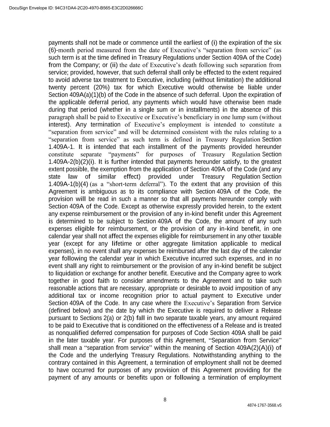 8 4874-1767-3568.v5 payments shall not be made or commence until the earliest of (i) the expiration of the six (6)-month period measured from the date of Executive’s “separation from service” (as such term is at the time defined in Treasury Regulations under Section 409A of the Code) from the Company; or (ii) the date of Executive’s death following such separation from service; provided, however, that such deferral shall only be effected to the extent required to avoid adverse tax treatment to Executive, including (without limitation) the additional twenty percent (20%) tax for which Executive would otherwise be liable under Section 409A(a)(1)(b) of the Code in the absence of such deferral. Upon the expiration of the applicable deferral period, any payments which would have otherwise been made during that period (whether in a single sum or in installments) in the absence of this paragraph shall be paid to Executive or Executive’s beneficiary in one lump sum (without interest). Any termination of Executive’s employment is intended to constitute a “separation from service” and will be determined consistent with the rules relating to a “separation from service” as such term is defined in Treasury Regulation Section 1.409A-1. It is intended that each installment of the payments provided hereunder constitute separate “payments” for purposes of Treasury Regulation Section 1.409A-2(b)(2)(i). It is further intended that payments hereunder satisfy, to the greatest extent possible, the exemption from the application of Section 409A of the Code (and any state law of similar effect) provided under Treasury Regulation Section 1.409A-1(b)(4) (as a “short-term deferral”). To the extent that any provision of this Agreement is ambiguous as to its compliance with Section 409A of the Code, the provision will be read in such a manner so that all payments hereunder comply with Section 409A of the Code. Except as otherwise expressly provided herein, to the extent any expense reimbursement or the provision of any in-kind benefit under this Agreement is determined to be subject to Section 409A of the Code, the amount of any such expenses eligible for reimbursement, or the provision of any in-kind benefit, in one calendar year shall not affect the expenses eligible for reimbursement in any other taxable year (except for any lifetime or other aggregate limitation applicable to medical expenses), in no event shall any expenses be reimbursed after the last day of the calendar year following the calendar year in which Executive incurred such expenses, and in no event shall any right to reimbursement or the provision of any in-kind benefit be subject to liquidation or exchange for another benefit. Executive and the Company agree to work together in good faith to consider amendments to the Agreement and to take such reasonable actions that are necessary, appropriate or desirable to avoid imposition of any additional tax or income recognition prior to actual payment to Executive under Section 409A of the Code. In any case where the Executive’s Separation from Service (defined below) and the date by which the Executive is required to deliver a Release pursuant to Sections 2(a) or 2(b) fall in two separate taxable years, any amount required to be paid to Executive that is conditioned on the effectiveness of a Release and is treated as nonqualified deferred compensation for purposes of Code Section 409A shall be paid in the later taxable year. For purposes of this Agreement, “Separation from Service” shall mean a “separation from service” within the meaning of Section 409A(2)(A)(i) of the Code and the underlying Treasury Regulations. Notwithstanding anything to the contrary contained in this Agreement, a termination of employment shall not be deemed to have occurred for purposes of any provision of this Agreement providing for the payment of any amounts or benefits upon or following a termination of employment DocuSign Envelope ID: 94C31DA4-2C20-4970-B565-E3C2D026666C
