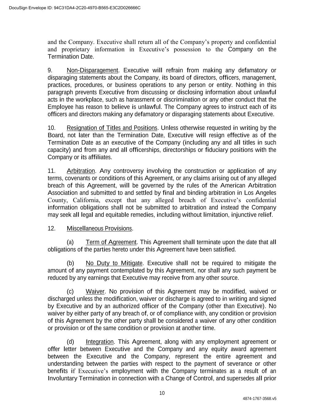 10 4874-1767-3568.v5 and the Company. Executive shall return all of the Company’s property and confidential and proprietary information in Executive’s possession to the Company on the Termination Date. 9. Non-Disparagement. Executive will refrain from making any defamatory or disparaging statements about the Company, its board of directors, officers, management, practices, procedures, or business operations to any person or entity. Nothing in this paragraph prevents Executive from discussing or disclosing information about unlawful acts in the workplace, such as harassment or discrimination or any other conduct that the Employee has reason to believe is unlawful. The Company agrees to instruct each of its officers and directors making any defamatory or disparaging statements about Executive. 10. Resignation of Titles and Positions. Unless otherwise requested in writing by the Board, not later than the Termination Date, Executive will resign effective as of the Termination Date as an executive of the Company (including any and all titles in such capacity) and from any and all officerships, directorships or fiduciary positions with the Company or its affiliates. 11. Arbitration. Any controversy involving the construction or application of any terms, covenants or conditions of this Agreement, or any claims arising out of any alleged breach of this Agreement, will be governed by the rules of the American Arbitration Association and submitted to and settled by final and binding arbitration in Los Angeles County, California, except that any alleged breach of Executive’s confidential information obligations shall not be submitted to arbitration and instead the Company may seek all legal and equitable remedies, including without limitation, injunctive relief. 12. Miscellaneous Provisions. (a) Term of Agreement. This Agreement shall terminate upon the date that all obligations of the parties hereto under this Agreement have been satisfied. (b) No Duty to Mitigate. Executive shall not be required to mitigate the amount of any payment contemplated by this Agreement, nor shall any such payment be reduced by any earnings that Executive may receive from any other source. (c) Waiver. No provision of this Agreement may be modified, waived or discharged unless the modification, waiver or discharge is agreed to in writing and signed by Executive and by an authorized officer of the Company (other than Executive). No waiver by either party of any breach of, or of compliance with, any condition or provision of this Agreement by the other party shall be considered a waiver of any other condition or provision or of the same condition or provision at another time. (d) Integration. This Agreement, along with any employment agreement or offer letter between Executive and the Company and any equity award agreement between the Executive and the Company, represent the entire agreement and understanding between the parties with respect to the payment of severance or other benefits if Executive’s employment with the Company terminates as a result of an Involuntary Termination in connection with a Change of Control, and supersedes all prior DocuSign Envelope ID: 94C31DA4-2C20-4970-B565-E3C2D026666C