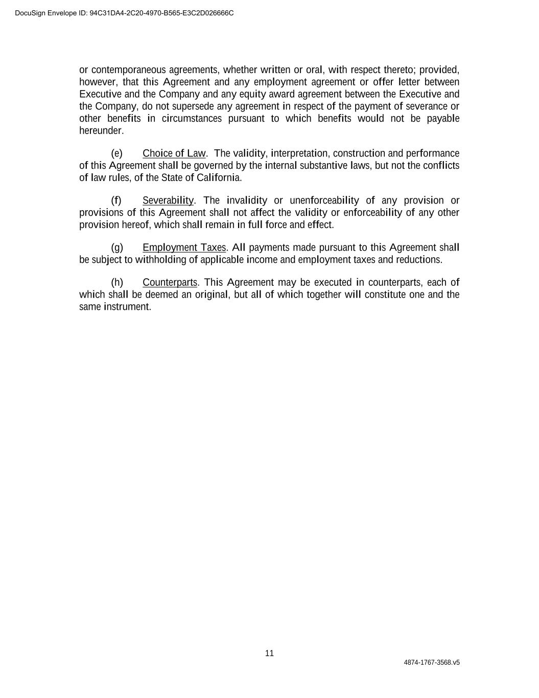 11 4874-1767-3568.v5 or contemporaneous agreements, whether written or oral, with respect thereto; provided, however, that this Agreement and any employment agreement or offer letter between Executive and the Company and any equity award agreement between the Executive and the Company, do not supersede any agreement in respect of the payment of severance or other benefits in circumstances pursuant to which benefits would not be payable hereunder. (e) Choice of Law. The validity, interpretation, construction and performance of this Agreement shall be governed by the internal substantive laws, but not the conflicts of law rules, of the State of California. (f) Severability. The invalidity or unenforceability of any provision or provisions of this Agreement shall not affect the validity or enforceability of any other provision hereof, which shall remain in full force and effect. (g) Employment Taxes. All payments made pursuant to this Agreement shall be subject to withholding of applicable income and employment taxes and reductions. (h) Counterparts. This Agreement may be executed in counterparts, each of which shall be deemed an original, but all of which together will constitute one and the same instrument. DocuSign Envelope ID: 94C31DA4-2C20-4970-B565-E3C2D026666C