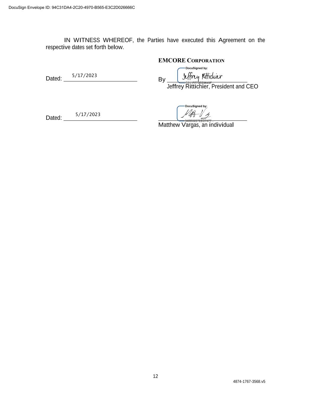 12 4874-1767-3568.v5 IN WITNESS WHEREOF, the Parties have executed this Agreement on the respective dates set forth below. Dated: EMCORE CORPORATION By Jeffrey Rittichier, President and CEO Dated: Matthew Vargas, an individual DocuSign Envelope ID: 94C31DA4-2C20-4970-B565-E3C2D026666C 5/17/2023 5/17/2023