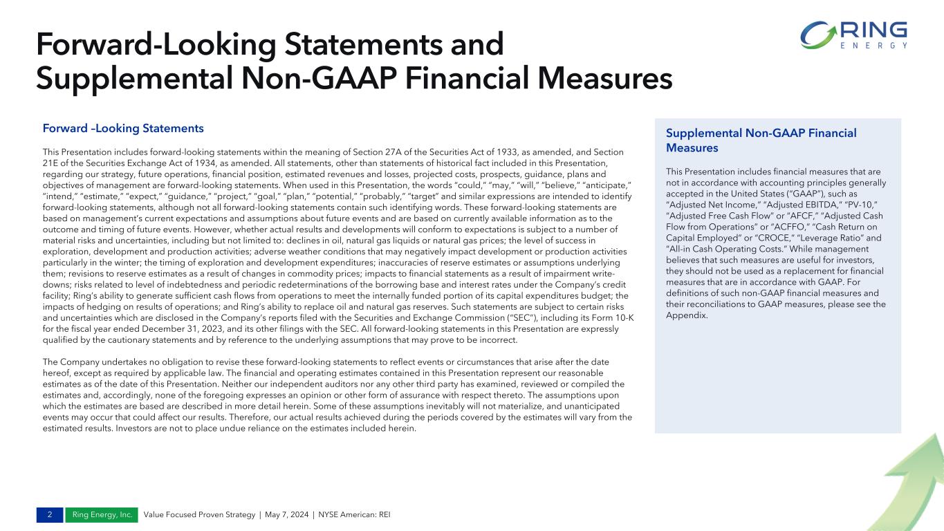Ring Energy, Inc. Forward –Looking Statements This Presentation includes forward-looking statements within the meaning of Section 27A of the Securities Act of 1933, as amended, and Section 21E of the Securities Exchange Act of 1934, as amended. All statements, other than statements of historical fact included in this Presentation, regarding our strategy, future operations, financial position, estimated revenues and losses, projected costs, prospects, guidance, plans and objectives of management are forward-looking statements. When used in this Presentation, the words “could,” “may,” “will,” “believe,” “anticipate,” “intend,” “estimate,” “expect,” “guidance,” “project,” “goal,” “plan,” “potential,” “probably,” “target” and similar expressions are intended to identify forward-looking statements, although not all forward-looking statements contain such identifying words. These forward-looking statements are based on management’s current expectations and assumptions about future events and are based on currently available information as to the outcome and timing of future events. However, whether actual results and developments will conform to expectations is subject to a number of material risks and uncertainties, including but not limited to: declines in oil, natural gas liquids or natural gas prices; the level of success in exploration, development and production activities; adverse weather conditions that may negatively impact development or production activities particularly in the winter; the timing of exploration and development expenditures; inaccuracies of reserve estimates or assumptions underlying them; revisions to reserve estimates as a result of changes in commodity prices; impacts to financial statements as a result of impairment write- downs; risks related to level of indebtedness and periodic redeterminations of the borrowing base and interest rates under the Company’s credit facility; Ring’s ability to generate sufficient cash flows from operations to meet the internally funded portion of its capital expenditures budget; the impacts of hedging on results of operations; and Ring’s ability to replace oil and natural gas reserves. Such statements are subject to certain risks and uncertainties which are disclosed in the Company’s reports filed with the Securities and Exchange Commission (“SEC”), including its Form 10-K for the fiscal year ended December 31, 2023, and its other filings with the SEC. All forward-looking statements in this Presentation are expressly qualified by the cautionary statements and by reference to the underlying assumptions that may prove to be incorrect. The Company undertakes no obligation to revise these forward-looking statements to reflect events or circumstances that arise after the date hereof, except as required by applicable law. The financial and operating estimates contained in this Presentation represent our reasonable estimates as of the date of this Presentation. Neither our independent auditors nor any other third party has examined, reviewed or compiled the estimates and, accordingly, none of the foregoing expresses an opinion or other form of assurance with respect thereto. The assumptions upon which the estimates are based are described in more detail herein. Some of these assumptions inevitably will not materialize, and unanticipated events may occur that could affect our results. Therefore, our actual results achieved during the periods covered by the estimates will vary from the estimated results. Investors are not to place undue reliance on the estimates included herein. Forward-Looking Statements and Supplemental Non-GAAP Financial Measures 2 Value Focused Proven Strategy | May 7, 2024 | NYSE American: REI Supplemental Non-GAAP Financial Measures This Presentation includes financial measures that are not in accordance with accounting principles generally accepted in the United States (“GAAP”), such as “Adjusted Net Income,” “Adjusted EBITDA,” “PV-10,” “Adjusted Free Cash Flow” or “AFCF,” “Adjusted Cash Flow from Operations” or “ACFFO,” “Cash Return on Capital Employed” or “CROCE,” “Leverage Ratio” and “All-in Cash Operating Costs.” While management believes that such measures are useful for investors, they should not be used as a replacement for financial measures that are in accordance with GAAP. For definitions of such non-GAAP financial measures and their reconciliations to GAAP measures, please see the Appendix.