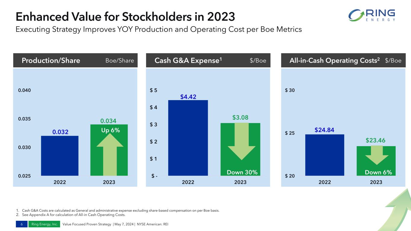 Ring Energy, Inc. 1. Adjusted EBITDA, and Adjusted Free Cash Flow are Non-GAAP financial measures. See Appendix for reconciliation to GAAP measures. 2. Cash G&A Costs are calculated as General and administrative expense excluding share-based compensation on per Boe basis 3. Leverage Ratio is defined in Appendix. 4. Liquidity is defined as cash and cash equivalents plus borrowing base availability under the Company’s credit agreement. 2024 Q1 Highlights 5 Value Focused Proven Strategy | May 7, 2024 | NYSE American: REI Proven Strategy Leads to Superior Results Operations Lifting Cost Oil Sales Bo Adjusted EBITDA1 CapEx Cash G&A Costs2 Adjusted Free Cash Flow1 Leverage Ratio3 13,394 Bo/d Q1 2024 $10.60 Per Boe Q1 2024 12,660 Bo/d Q1 2023 $62.0 Million Q1 2024 $36.3 Million Q1 2024 $15.6 Million Q1 2024 1.67x Ratio Q1 2024 $3.32 Per Boe Q1 2024 $10.61 Per Boe Q1 2023 $58.6 Million Q1 2023 $38.9 Million Q1 2023 $3.15 Per Boe Q1 2023 1.65x Ratio Q1 2023 $10.5 Million Q1 2023 Sales Boe 19,034 Boe/d Q1 2024 18,292 Boe/d Q1 2023 Debt Balance $422 Million Q1 2024 $422 Million Q1 2023 Liquidity4 $179 Million Q1 2024 $179 Million Q1 2023 69% Oil 70% Oil 6% 4% 6% 48% 7% 5%
