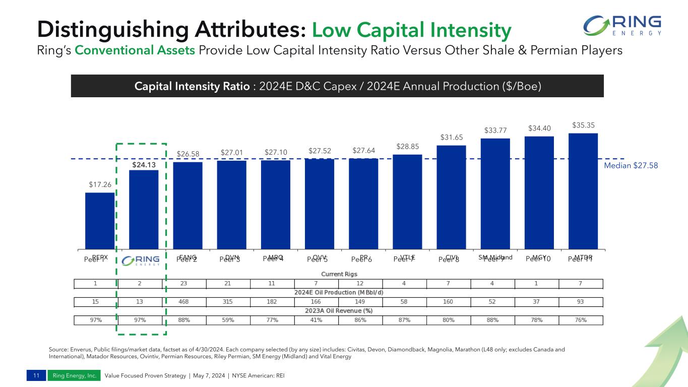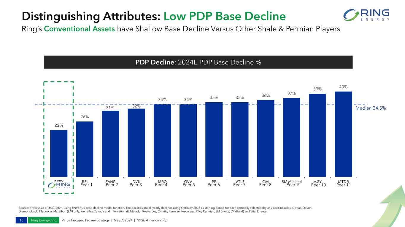 Ring Energy, Inc. REPX REI FANG DVN MRO OVV PR VTLE CIVI SM Midland MGY MTDR 22% 26% 31% 32% 34% 34% 35% 35% 36% 37% 39% 40% Distinguishing Attributes: Low PDP Base Decline Ring’s Conventional Assets have Shallow Base Decline Versus Other Shale & Permian Players Peer 1 Peer 2 Peer 3 Peer 4 Peer 5 Peer 6 Peer 7 Peer 8 Peer 9 Peer 10 Peer 11 PDP Decline: 2024E PDP Base Decline % Value Focused Proven Strategy | May 7, 2024 | NYSE American: REI Source: Enverus as of 4/30/2024, using ENVERUS base decline model function. The declines are all yearly declines using Oct/Nov 2023 as starting period for each company selected (by any size) includes: Civitas, Devon, Diamondback, Magnolia, Marathon (L48 only; excludes Canada and International), Matador Resources, Ovintiv, Permian Resources, Riley Permian, SM Energy (Midland) and Vital Energy 10 Median 34.5%