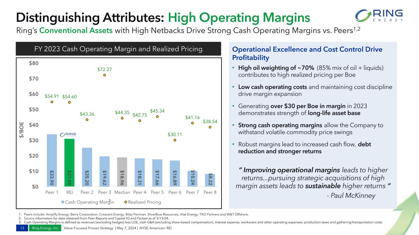 Ring Energy, Inc. Peer 1 REI Peer 2 Peer 3 Peer 4 Peer 5 Peer 6 Peer 7 Peer 8 0% 20% 40% 60% 80% 100% 94% 70% 68% 47% 43% 41% 39% 27% 27% Distinguishing Attributes: Long Life Reserves & Oil % Ring’s Conventional Assets have Extended Reserve Life and are Oily Versus Peers of Similar Size1,2 Peer 1 Peer 2 Peer 3 Peer 4 Peer 5 Peer 6 Peer 7 Peer 8 Peer 9 Peer 10 Peer 11 Reserve Life: YE 2023 SEC Proved Reserves / Q4’23 Annualized Production Value Focused Proven Strategy | May 7, 2024 | NYSE American: REI12 R es er ve L ife (Y rs ) REI Peer 1 Peer 2 Peer 3 Peer 4 Peer 5 Peer 6 Peer 7 Peer 8 0 5 10 15 20 % Oil: Q4’23 Sales Production 1. Peers based on similar size sub $2B market cap and include: Amplify Energy, Berry Corporation, Crescent Energy, Riley Permian, SilverBow Resources, Vital Energy, TXO Partners and W&T Offshore. 2. Source information for data obtained from Peer Reports and Factset as of 5/1/24. Median 43% Median 12yrs