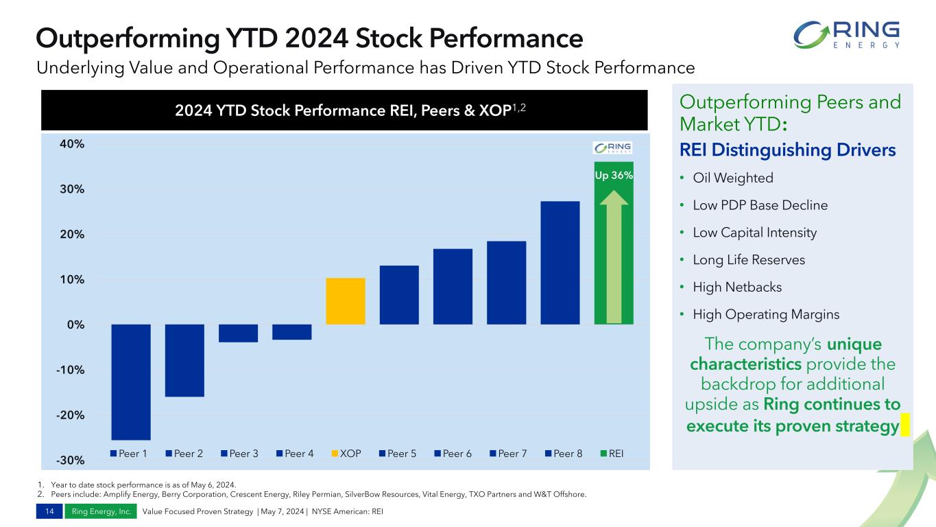 Ring Energy, Inc. $ /B O E Peer 8Peer 7 Peer 6Peer 5Peer 4MedianPeer 3Peer 2REIPeer 1 $0 $10 $20 $30 $40 $50 $60 $70 $80 $ 8 .2 2 $ 1 0 .2 4 $ 1 6 .8 9 $ 1 7 .6 6 $ 1 8 .3 1 $ 1 8 .9 6 $ 1 9 .6 2 $ 2 5 .2 0 $ 3 1 .0 0 $ 3 3 .9 0 $38.54 $41.16 $30.11 $45.34 $42.75$44.35 $72.27 $43.36 $54.60$54.91 Cash Operating Margin Realized Pricing Distinguishing Attributes: High Operating Margins 13 Value Focused Proven Strategy | May 7, 2024 | NYSE American: REI Ring’s Conventional Assets with High Netbacks Drive Strong Cash Operating Margins vs. Peers1,2 FY 2023 Cash Operating Margin and Realized Pricing Operational Excellence and Cost Control Drive Profitability • High oil weighting of ~70% (85% mix of oil + liquids) contributes to high realized pricing per Boe • Low cash operating costs and maintaining cost discipline drive margin expansion • Generating over $30 per Boe in margin in 2023 demonstrates strength of long-life asset base • Strong cash operating margins allow the Company to withstand volatile commodity price swings • Robust margins lead to increased cash flow, debt reduction and stronger returns “ Improving operational margins leads to higher returns...pursuing strategic acquisitions of high margin assets leads to sustainable higher returns “ - Paul McKinney 1. Peers include: Amplify Energy, Berry Corporation, Crescent Energy, Riley Permian, SilverBow Resources, Vital Energy, TXO Partners and W&T Offshore. 2. Source information for data obtained from Peer Reports and Capital IQ and Factset as of 3/13/24. 3. Cash Operating Margins is defined as revenues (excluding hedges) less LOE, cash G&A (excluding share-based compensation), interest expense, workovers and other operating expenses, production taxes and gathering/transportation costs. 3