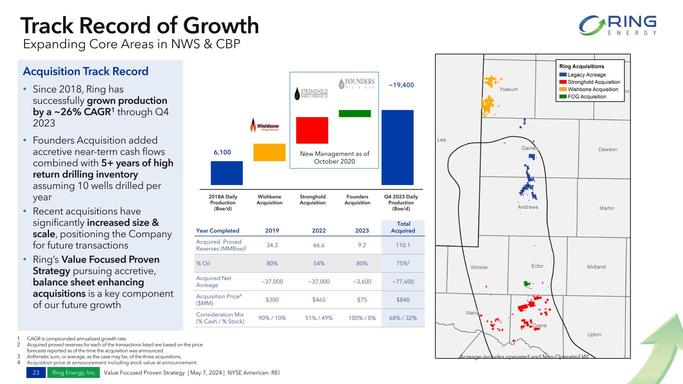 Ring Energy, Inc. Track Record of Growth 23 Value Focused Proven Strategy | May 7, 2024 | NYSE American: REI Acquisition Track Record • Since 2018, Ring has successfully grown production by a ~26% CAGR1 through Q4 2023 • Founders Acquisition added accretive near-term cash flows combined with 5+ years of high return drilling inventory assuming 10 wells drilled per year • Recent acquisitions have significantly increased size & scale, positioning the Company for future transactions • Ring’s Value Focused Proven Strategy pursuing accretive, balance sheet enhancing acquisitions is a key component of our future growth 1 CAGR is compounded annualized growth rate. 2 Acquired proved reserves for each of the transactions listed are based on the price forecasts reported as of the time the acquisition was announced. 3 Arithmetic sum, or average, as the case may be, of the three acquisitions. 4 Acquisition price at announcement including stock value at announcement. Year Completed 2019 2022 2023 Total Acquired Acquired Proved Reserves (MMBoe)2 34.3 66.6 9.2 110.1 % Oil 80% 54% 80% 75%3 Acquired Net Acreage ~37,000 ~37,000 ~3,600 ~77,600 Acquisition Price4 ($MM) $300 $465 $75 $840 Consideration Mix (% Cash / % Stock) 90% / 10% 51% / 49% 100% / 0% 68% / 32% 2018A Daily Production (Boe/d) Wishbone Acquisition Stronghold Acquisition Founders Acquisition Q4 2023 Daily Production (Boe/d) New Management as of October 2020 6,100 ~19,400 Acreage includes operated and Non-Operated WI Expanding Core Areas in NWS & CBP