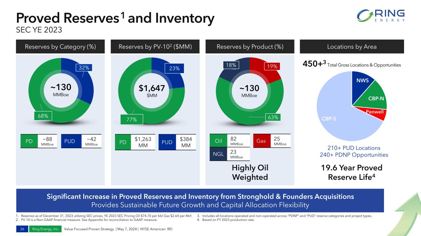 Ring Energy, Inc. N et O il Sa le s B o p d + G as S al es B o ep d + N G L Sa le s B o ep d Q1 '21 Q2 '21 Q3 '21 Q4 '21 Q1 '22 Q2 '22 Q3 '22 Q4 '22 Q1 '23 Q2 '23 Q3 '23 Q4 '23 Q1 '24 0 2,000 4,000 6,000 8,000 10,000 12,000 14,000 16,000 18,000 20,000 6,779 7,719 7,166 7,774 7,514 8,016 10,139 12,189 12,660 11,861 12,028 13,637 13,394 1,181 991 1,078 1,380 1,356 1,325 1,726 3,044 2,966 2,853 2,839 2,922 2,741 1,414 2,623 2,667 2,557 2,643 2,837 2,899 Company Oil Bopd Company Gas Boepd Company NGL Boepd 2024 Q1 Operations Update 25 Value Focused Proven Strategy | May 7, 2024 | NYSE American: REI Capital allocation and drilling programs designed to maximize free cash flow generation Historical Quarterly Net Sales Production1 1. Source is factset quarterly financials. Q3 Stronghold AQ – moved to 3 stream 2021 “phased drilling” Total 13 Hz 2022 “continuous drilling” Total 27 Hz & 7 Vert. Company Record Net Sales ~ 19,400 DLWR Sale & pullback in capex spend in anticipation of Founders AQ Founders AQ Closed 8/15 & New Mexico Sale 1H 2023 “phased drilling” 8 Hz & 5 Vert. 2H 2023 “continuous drilling” 12 Hz & 6 Vert. Net Sales 19,034 2024 “phased drilling” 5 Hz & 6 Vert. Founders AQ and focus on oily inventory Oil Bopd Gas Boepd NGL Boepd