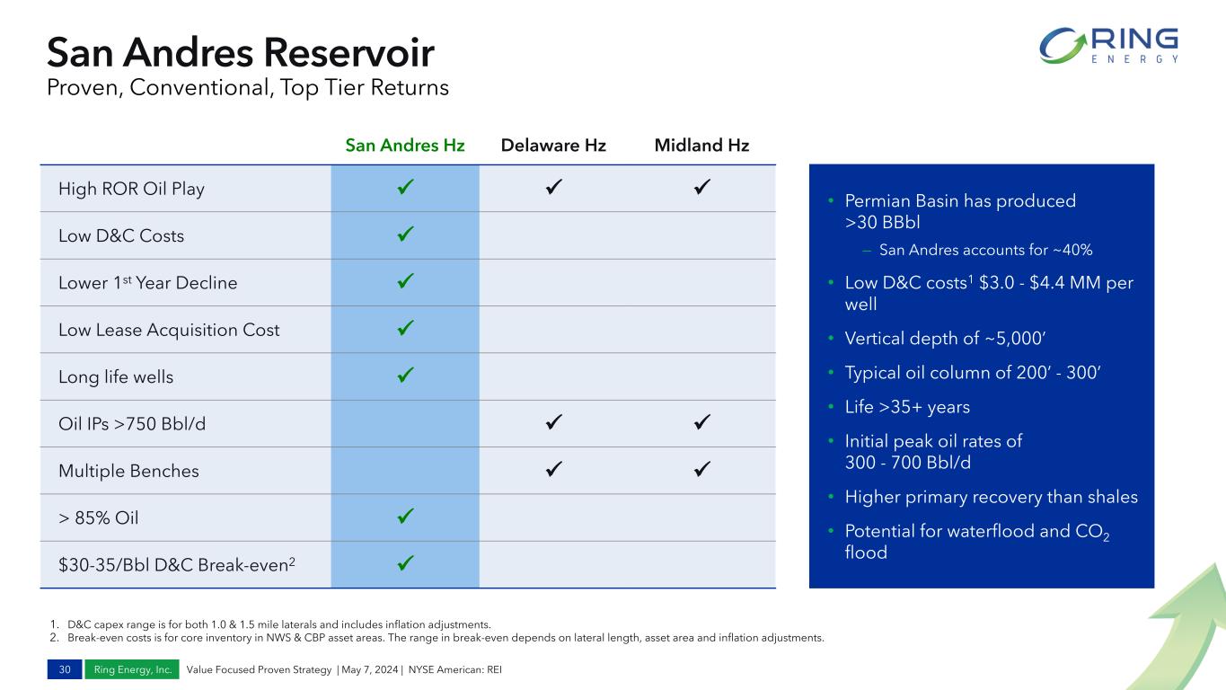 Ring Energy, Inc. Assets Overview 29 Value Focused Proven Strategy | May 7, 2024 | NYSE American: REI Central Basin Platform 1 Other CBP includes the average well performance of 2022 vertical new wells drilled in Ector and Crane Counties not operated by Ring or Founders (“FOG”). The source for the Other CBP performance information was the Texas Railroad Commission. REI performance includes the average well performance of 2022 vertical new wells drilled in McKnight and PJ Lea fields and includes previously drilled Stronghold vertical wells. FOG performance includes the average well performance of 2022 vertical new wells drilled in Ector County. The source for the performance information for REI and FOG wells is Ring Energy, Inc. High Quality Inventory • Inventory of 50+ low risk, high rate-of-return drilling locations lowers Ring’s breakeven costs • Recent Penwell vertical wells demonstrate superior initial performance to other recently drilled vertical wells in Ector and northern Crane counties • High oil cuts of the Penwell assets and inventory improve Ring’s 2024 commodity mix to ~70% Oil 40 acre spacing 20 acre spacing 50+ Gross Locations Increased High Quality Inventory Inventory Breakdown Attractive Assets & Production 2022 CBP Vertical Production1 G ro ss C um 1 80 -D ay /W el l A vg ., Tw o- S tre am B O E Other CBP REI FOG 0 5,000 10,000 15,000 20,000 25,000 64% Oil 64-82% Oil >90% Oil D&C Capex: $1.3 – 1.6MM $1.85 - 2.0MM Locations include 1P, 2P & 3P Penwell Area Inventory of High-Return Locations Compete for Capital in 2024 Penwell Penwell Acreage Existing Acreage