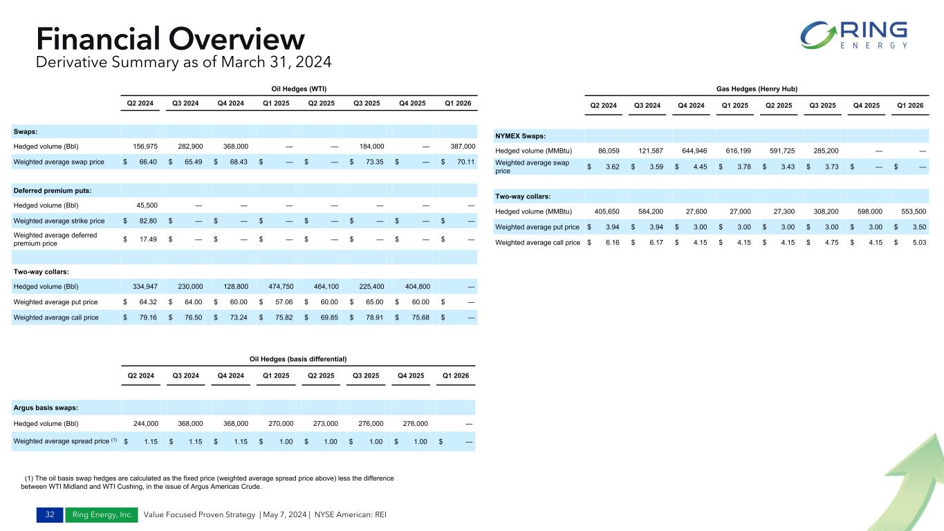 Ring Energy, Inc. Financial Overview 32 Value Focused Proven Strategy | May 7, 2024 | NYSE American: REI Derivative Summary as of March 31, 2024 (1) The oil basis swap hedges are calculated as the fixed price (weighted average spread price above) less the difference between WTI Midland and WTI Cushing, in the issue of Argus Americas Crude. Gas Hedges (Henry Hub) Q2 2024 Q3 2024 Q4 2024 Q1 2025 Q2 2025 Q3 2025 Q4 2025 Q1 2026 NYMEX Swaps: Hedged volume (MMBtu) 86,059 121,587 644,946 616,199 591,725 285,200 — — Weighted average swap price $ 3.62 $ 3.59 $ 4.45 $ 3.78 $ 3.43 $ 3.73 $ — $ — Two-way collars: Hedged volume (MMBtu) 405,650 584,200 27,600 27,000 27,300 308,200 598,000 553,500 Weighted average put price $ 3.94 $ 3.94 $ 3.00 $ 3.00 $ 3.00 $ 3.00 $ 3.00 $ 3.50 Weighted average call price $ 6.16 $ 6.17 $ 4.15 $ 4.15 $ 4.15 $ 4.75 $ 4.15 $ 5.03 Oil Hedges (WTI) Q2 2024 Q3 2024 Q4 2024 Q1 2025 Q2 2025 Q3 2025 Q4 2025 Q1 2026 Swaps: Hedged volume (Bbl) 156,975 282,900 368,000 — — 184,000 — 387,000 Weighted average swap price $ 66.40 $ 65.49 $ 68.43 $ — $ — $ 73.35 $ — $ 70.11 Deferred premium puts: Hedged volume (Bbl) 45,500 — — — — — — — Weighted average strike price $ 82.80 $ — $ — $ — $ — $ — $ — $ — Weighted average deferred premium price $ 17.49 $ — $ — $ — $ — $ — $ — $ — Two-way collars: Hedged volume (Bbl) 334,947 230,000 128,800 474,750 464,100 225,400 404,800 — Weighted average put price $ 64.32 $ 64.00 $ 60.00 $ 57.06 $ 60.00 $ 65.00 $ 60.00 $ — Weighted average call price $ 79.16 $ 76.50 $ 73.24 $ 75.82 $ 69.85 $ 78.91 $ 75.68 $ — Oil Hedges (basis differential) Q2 2024 Q3 2024 Q4 2024 Q1 2025 Q2 2025 Q3 2025 Q4 2025 Q1 2026 Argus basis swaps: Hedged volume (Bbl) 244,000 368,000 368,000 270,000 273,000 276,000 276,000 — Weighted average spread price (1) $ 1.15 $ 1.15 $ 1.15 $ 1.00 $ 1.00 $ 1.00 $ 1.00 $ —