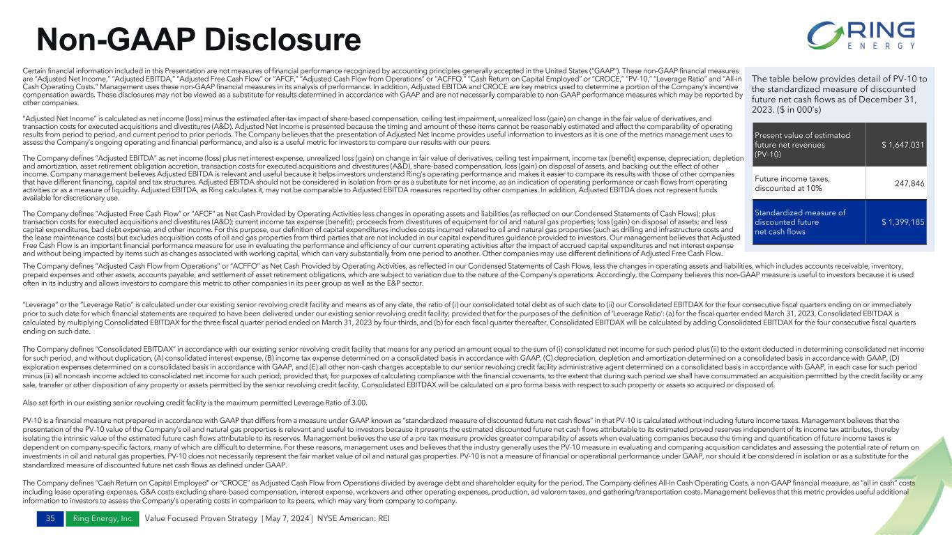 Ring Energy, Inc. The Company defines “Adjusted Cash Flow from Operations” or “ACFFO” as Net Cash Provided by Operating Activities, as reflected in our Condensed Statements of Cash Flows, less the changes in operating assets and liabilities, which includes accounts receivable, inventory, prepaid expenses and other assets, accounts payable, and settlement of asset retirement obligations, which are subject to variation due to the nature of the Company’s operations. Accordingly, the Company believes this non-GAAP measure is useful to investors because it is used often in its industry and allows investors to compare this metric to other companies in its peer group as well as the E&P sector. “Leverage” or the “Leverage Ratio” is calculated under our existing senior revolving credit facility and means as of any date, the ratio of (i) our consolidated total debt as of such date to (ii) our Consolidated EBITDAX for the four consecutive fiscal quarters ending on or immediately prior to such date for which financial statements are required to have been delivered under our existing senior revolving credit facility; provided that for the purposes of the definition of ‘Leverage Ratio’: (a) for the fiscal quarter ended March 31, 2023, Consolidated EBITDAX is calculated by multiplying Consolidated EBITDAX for the three fiscal quarter period ended on March 31, 2023 by four-thirds, and (b) for each fiscal quarter thereafter, Consolidated EBITDAX will be calculated by adding Consolidated EBITDAX for the four consecutive fiscal quarters ending on such date. The Company defines “Consolidated EBITDAX” in accordance with our existing senior revolving credit facility that means for any period an amount equal to the sum of (i) consolidated net income for such period plus (ii) to the extent deducted in determining consolidated net income for such period, and without duplication, (A) consolidated interest expense, (B) income tax expense determined on a consolidated basis in accordance with GAAP, (C) depreciation, depletion and amortization determined on a consolidated basis in accordance with GAAP, (D) exploration expenses determined on a consolidated basis in accordance with GAAP, and (E) all other non-cash charges acceptable to our senior revolving credit facility administrative agent determined on a consolidated basis in accordance with GAAP, in each case for such period minus (iii) all noncash income added to consolidated net income for such period; provided that, for purposes of calculating compliance with the financial covenants, to the extent that during such period we shall have consummated an acquisition permitted by the credit facility or any sale, transfer or other disposition of any property or assets permitted by the senior revolving credit facility, Consolidated EBITDAX will be calculated on a pro forma basis with respect to such property or assets so acquired or disposed of. Also set forth in our existing senior revolving credit facility is the maximum permitted Leverage Ratio of 3.00. PV-10 is a financial measure not prepared in accordance with GAAP that differs from a measure under GAAP known as “standardized measure of discounted future net cash flows” in that PV-10 is calculated without including future income taxes. Management believes that the presentation of the PV-10 value of the Company’s oil and natural gas properties is relevant and useful to investors because it presents the estimated discounted future net cash flows attributable to its estimated proved reserves independent of its income tax attributes, thereby isolating the intrinsic value of the estimated future cash flows attributable to its reserves. Management believes the use of a pre-tax measure provides greater comparability of assets when evaluating companies because the timing and quantification of future income taxes is dependent on company-specific factors, many of which are difficult to determine. For these reasons, management uses and believes that the industry generally uses the PV-10 measure in evaluating and comparing acquisition candidates and assessing the potential rate of return on investments in oil and natural gas properties. PV-10 does not necessarily represent the fair market value of oil and natural gas properties. PV-10 is not a measure of financial or operational performance under GAAP, nor should it be considered in isolation or as a substitute for the standardized measure of discounted future net cash flows as defined under GAAP. The Company defines “Cash Return on Capital Employed” or “CROCE” as Adjusted Cash Flow from Operations divided by average debt and shareholder equity for the period. The Company defines All-In Cash Operating Costs, a non-GAAP financial measure, as “all in cash” costs including lease operating expenses, G&A costs excluding share-based compensation, interest expense, workovers and other operating expenses, production, ad valorem taxes, and gathering/transportation costs. Management believes that this metric provides useful additional information to investors to assess the Company’s operating costs in comparison to its peers, which may vary from company to company. Non-GAAP Disclosure 35 Value Focused Proven Strategy | May 7, 2024 | NYSE American: REI Certain financial information included in this Presentation are not measures of financial performance recognized by accounting principles generally accepted in the United States (“GAAP”). These non-GAAP financial measures are “Adjusted Net Income,” “Adjusted EBITDA,” “Adjusted Free Cash Flow” or “AFCF,” “Adjusted Cash Flow from Operations” or “ACFFO,” “Cash Return on Capital Employed” or “CROCE,” “PV-10,” “Leverage Ratio” and “All-in Cash Operating Costs.” Management uses these non-GAAP financial measures in its analysis of performance. In addition, Adjusted EBITDA and CROCE are key metrics used to determine a portion of the Company’s incentiv
