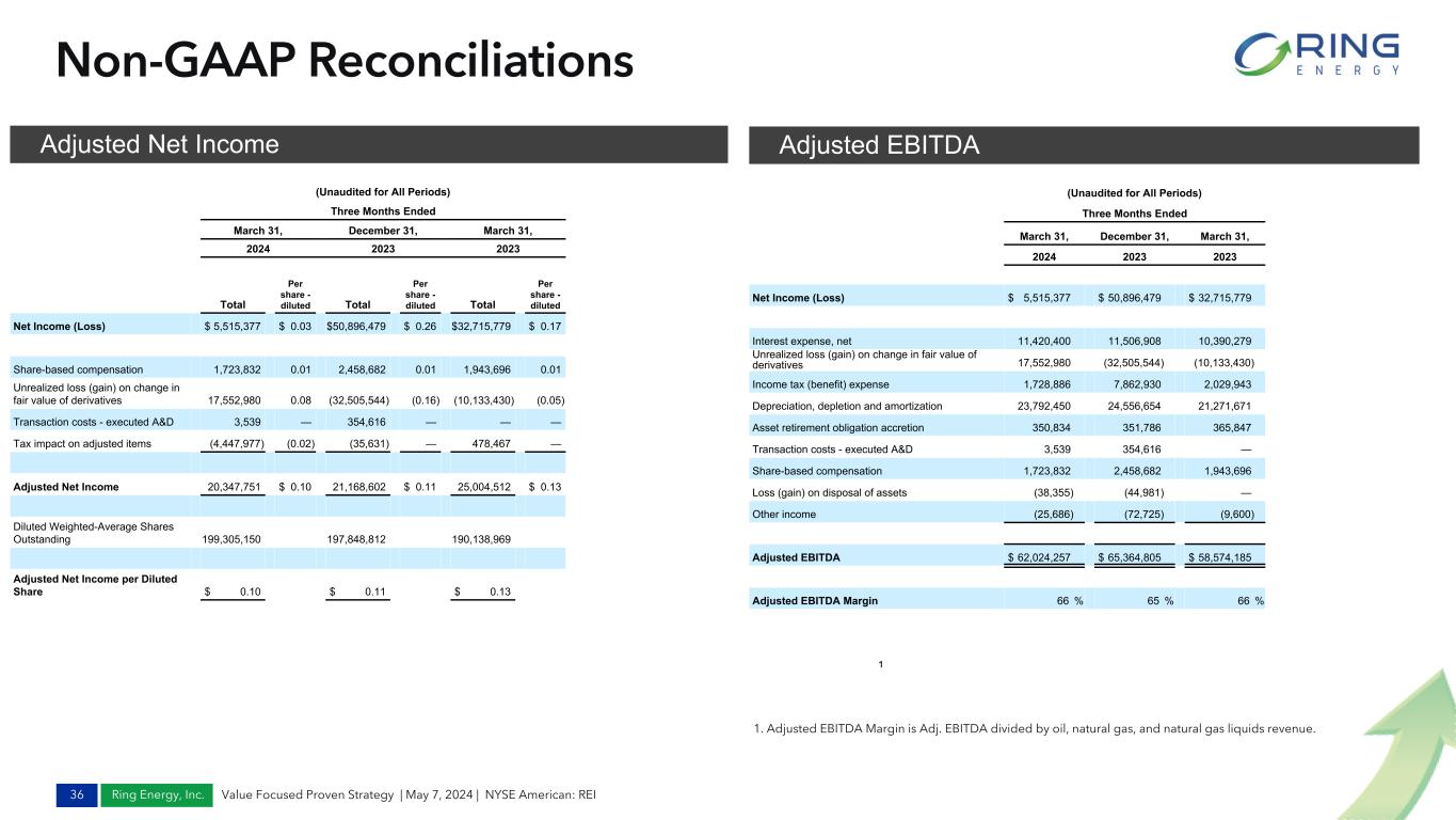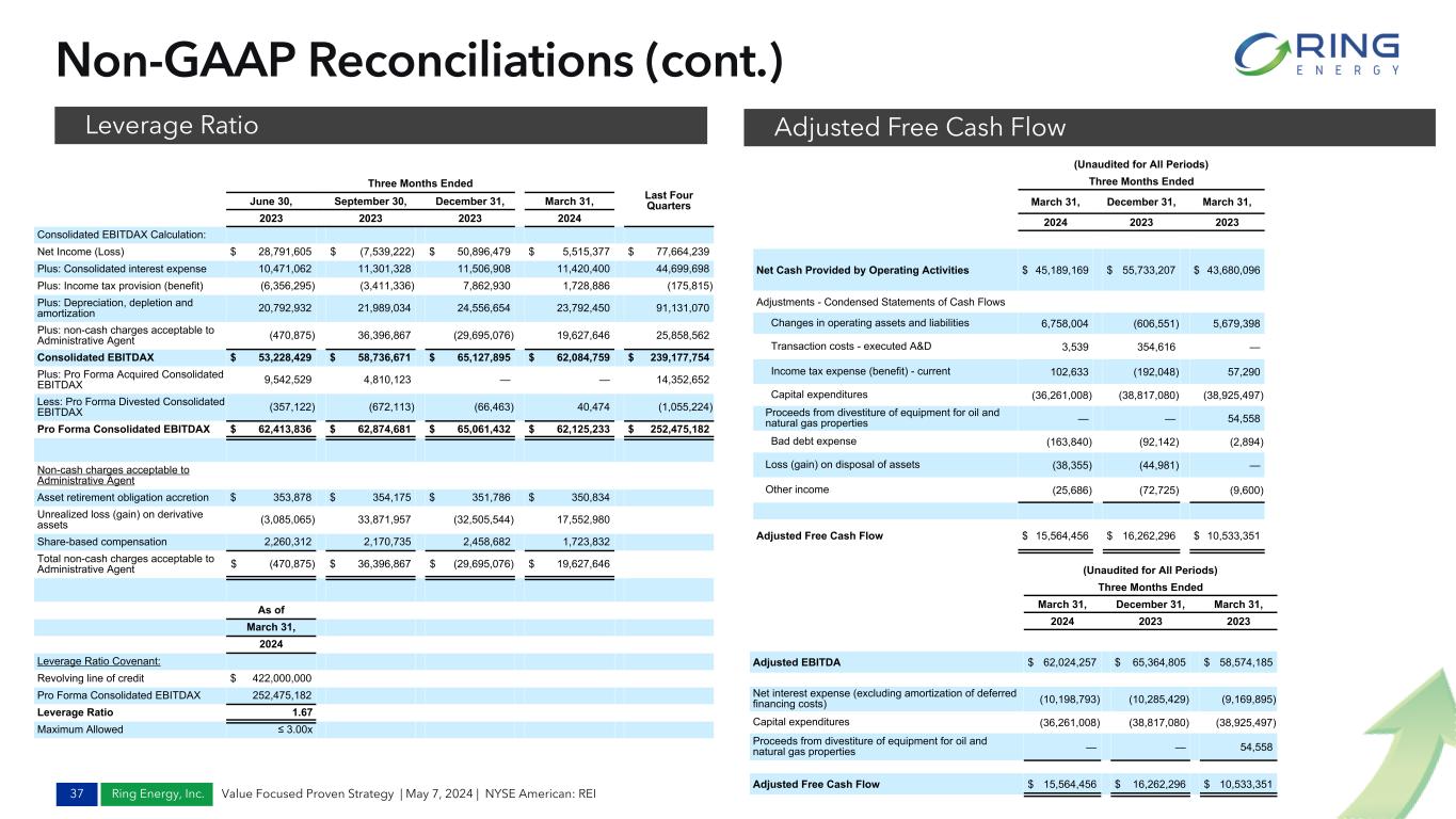 Ring Energy, Inc. Non-GAAP Reconciliations 36 Value Focused Proven Strategy | May 7, 2024 | NYSE American: REI Adjusted Net Income Adjusted EBITDA 1. Adjusted EBITDA Margin is Adj. EBITDA divided by oil, natural gas, and natural gas liquids revenue. (Unaudited for All Periods) Three Months Ended March 31, December 31, March 31, 2024 2023 2023 Total Per share - diluted Total Per share - diluted Total Per share - diluted Net Income (Loss) $ 5,515,377 $ 0.03 $50,896,479 $ 0.26 $32,715,779 $ 0.17 Share-based compensation 1,723,832 0.01 2,458,682 0.01 1,943,696 0.01 Unrealized loss (gain) on change in fair value of derivatives 17,552,980 0.08 (32,505,544) (0.16) (10,133,430) (0.05) Transaction costs - executed A&D 3,539 — 354,616 — — — Tax impact on adjusted items (4,447,977) (0.02) (35,631) — 478,467 — Adjusted Net Income 20,347,751 $ 0.10 21,168,602 $ 0.11 25,004,512 $ 0.13 Diluted Weighted-Average Shares Outstanding 199,305,150 197,848,812 190,138,969 Adjusted Net Income per Diluted Share $ 0.10 $ 0.11 $ 0.13 (Unaudited for All Periods) Three Months Ended March 31, December 31, March 31, 2024 2023 2023 Net Income (Loss) $ 5,515,377 $ 50,896,479 $ 32,715,779 Interest expense, net 11,420,400 11,506,908 10,390,279 Unrealized loss (gain) on change in fair value of derivatives 17,552,980 (32,505,544) (10,133,430) Income tax (benefit) expense 1,728,886 7,862,930 2,029,943 Depreciation, depletion and amortization 23,792,450 24,556,654 21,271,671 Asset retirement obligation accretion 350,834 351,786 365,847 Transaction costs - executed A&D 3,539 354,616 — Share-based compensation 1,723,832 2,458,682 1,943,696 Loss (gain) on disposal of assets (38,355) (44,981) — Other income (25,686) (72,725) (9,600) Adjusted EBITDA $ 62,024,257 $ 65,364,805 $ 58,574,185 Adjusted EBITDA Margin 66 % 65 % 66 % 1