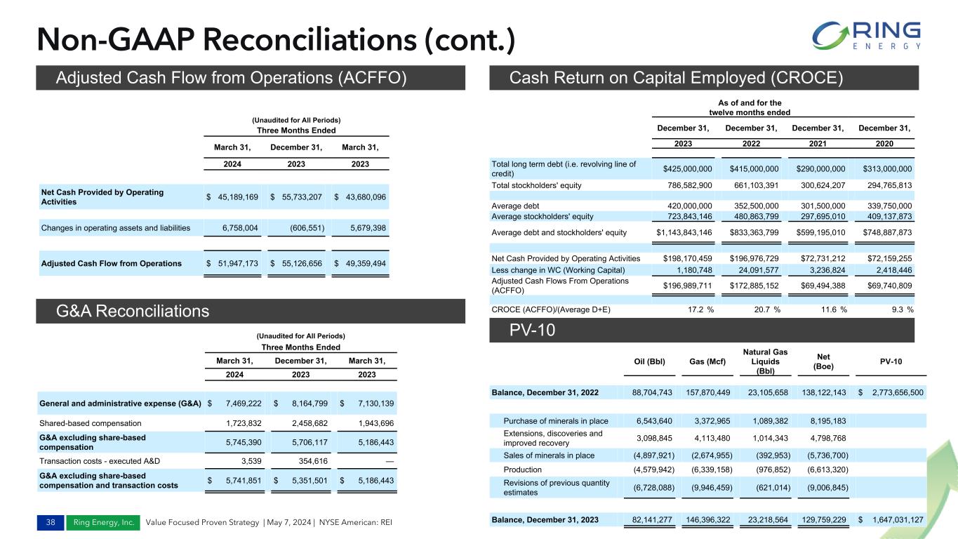 Ring Energy, Inc. Non-GAAP Reconciliations (cont.) 37 Value Focused Proven Strategy | May 7, 2024 | NYSE American: REI Leverage Ratio Adjusted Free Cash Flow (Unaudited for All Periods) Three Months Ended March 31, December 31, March 31, 2024 2023 2023 Net Cash Provided by Operating Activities $ 45,189,169 $ 55,733,207 $ 43,680,096 Adjustments - Condensed Statements of Cash Flows Changes in operating assets and liabilities 6,758,004 (606,551) 5,679,398 Transaction costs - executed A&D 3,539 354,616 — Income tax expense (benefit) - current 102,633 (192,048) 57,290 Capital expenditures (36,261,008) (38,817,080) (38,925,497) Proceeds from divestiture of equipment for oil and natural gas properties — — 54,558 Bad debt expense (163,840) (92,142) (2,894) Loss (gain) on disposal of assets (38,355) (44,981) — Other income (25,686) (72,725) (9,600) Adjusted Free Cash Flow $ 15,564,456 $ 16,262,296 $ 10,533,351 (Unaudited for All Periods) Three Months Ended March 31, December 31, March 31, 2024 2023 2023 Adjusted EBITDA $ 62,024,257 $ 65,364,805 $ 58,574,185 Net interest expense (excluding amortization of deferred financing costs) (10,198,793) (10,285,429) (9,169,895) Capital expenditures (36,261,008) (38,817,080) (38,925,497) Proceeds from divestiture of equipment for oil and natural gas properties — — 54,558 Adjusted Free Cash Flow $ 15,564,456 $ 16,262,296 $ 10,533,351 Three Months Ended Last Four QuartersJune 30, September 30, December 31, March 31, 2023 2023 2023 2024 Consolidated EBITDAX Calculation: Net Income (Loss) $ 28,791,605 $ (7,539,222) $ 50,896,479 $ 5,515,377 $ 77,664,239 Plus: Consolidated interest expense 10,471,062 11,301,328 11,506,908 11,420,400 44,699,698 Plus: Income tax provision (benefit) (6,356,295) (3,411,336) 7,862,930 1,728,886 (175,815) Plus: Depreciation, depletion and amortization 20,792,932 21,989,034 24,556,654 23,792,450 91,131,070 Plus: non-cash charges acceptable to Administrative Agent (470,875) 36,396,867 (29,695,076) 19,627,646 25,858,562 Consolidated EBITDAX $ 53,228,429 $ 58,736,671 $ 65,127,895 $ 62,084,759 $ 239,177,754 Plus: Pro Forma Acquired Consolidated EBITDAX 9,542,529 4,810,123 — — 14,352,652 Less: Pro Forma Divested Consolidated EBITDAX (357,122) (672,113) (66,463) 40,474 (1,055,224) Pro Forma Consolidated EBITDAX $ 62,413,836 $ 62,874,681 $ 65,061,432 $ 62,125,233 $ 252,475,182 Non-cash charges acceptable to Administrative Agent Asset retirement obligation accretion $ 353,878 $ 354,175 $ 351,786 $ 350,834 Unrealized loss (gain) on derivative assets (3,085,065) 33,871,957 (32,505,544) 17,552,980 Share-based compensation 2,260,312 2,170,735 2,458,682 1,723,832 Total non-cash charges acceptable to Administrative Agent $ (470,875) $ 36,396,867 $ (29,695,076) $ 19,627,646 As of March 31, 2024 Leverage Ratio Covenant: Revolving line of credit $ 422,000,000 Pro Forma Consolidated EBITDAX 252,475,182 Leverage Ratio 1.67 Maximum Allowed ≤ 3.00x