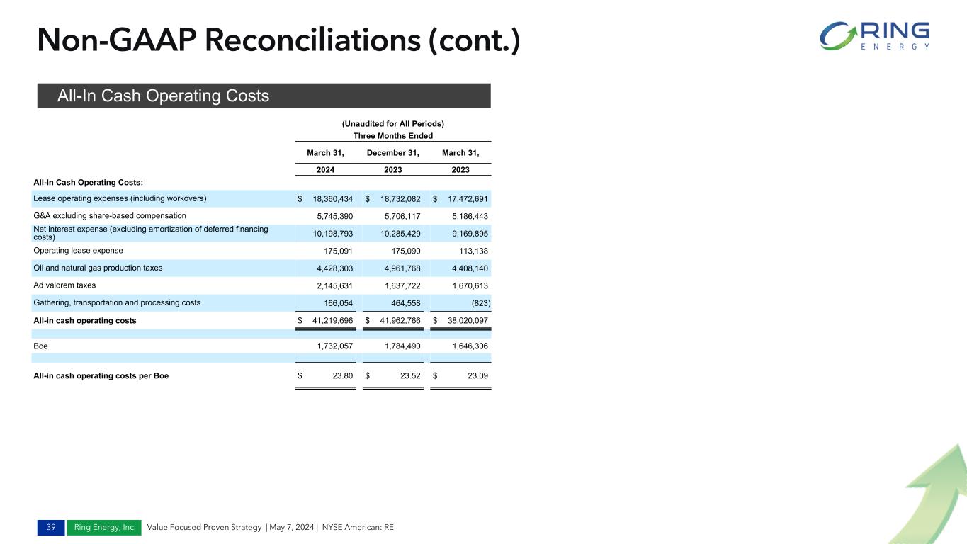 Ring Energy, Inc. Non-GAAP Reconciliations (cont.) 39 Value Focused Proven Strategy | May 7, 2024 | NYSE American: REI All-In Cash Operating Costs (Unaudited for All Periods) Three Months Ended March 31, December 31, March 31, 2024 2023 2023 All-In Cash Operating Costs: Lease operating expenses (including workovers) $ 18,360,434 $ 18,732,082 $ 17,472,691 G&A excluding share-based compensation 5,745,390 5,706,117 5,186,443 Net interest expense (excluding amortization of deferred financing costs) 10,198,793 10,285,429 9,169,895 Operating lease expense 175,091 175,090 113,138 Oil and natural gas production taxes 4,428,303 4,961,768 4,408,140 Ad valorem taxes 2,145,631 1,637,722 1,670,613 Gathering, transportation and processing costs 166,054 464,558 (823) All-in cash operating costs $ 41,219,696 $ 41,962,766 $ 38,020,097 Boe 1,732,057 1,784,490 1,646,306 All-in cash operating costs per Boe $ 23.80 $ 23.52 $ 23.09
