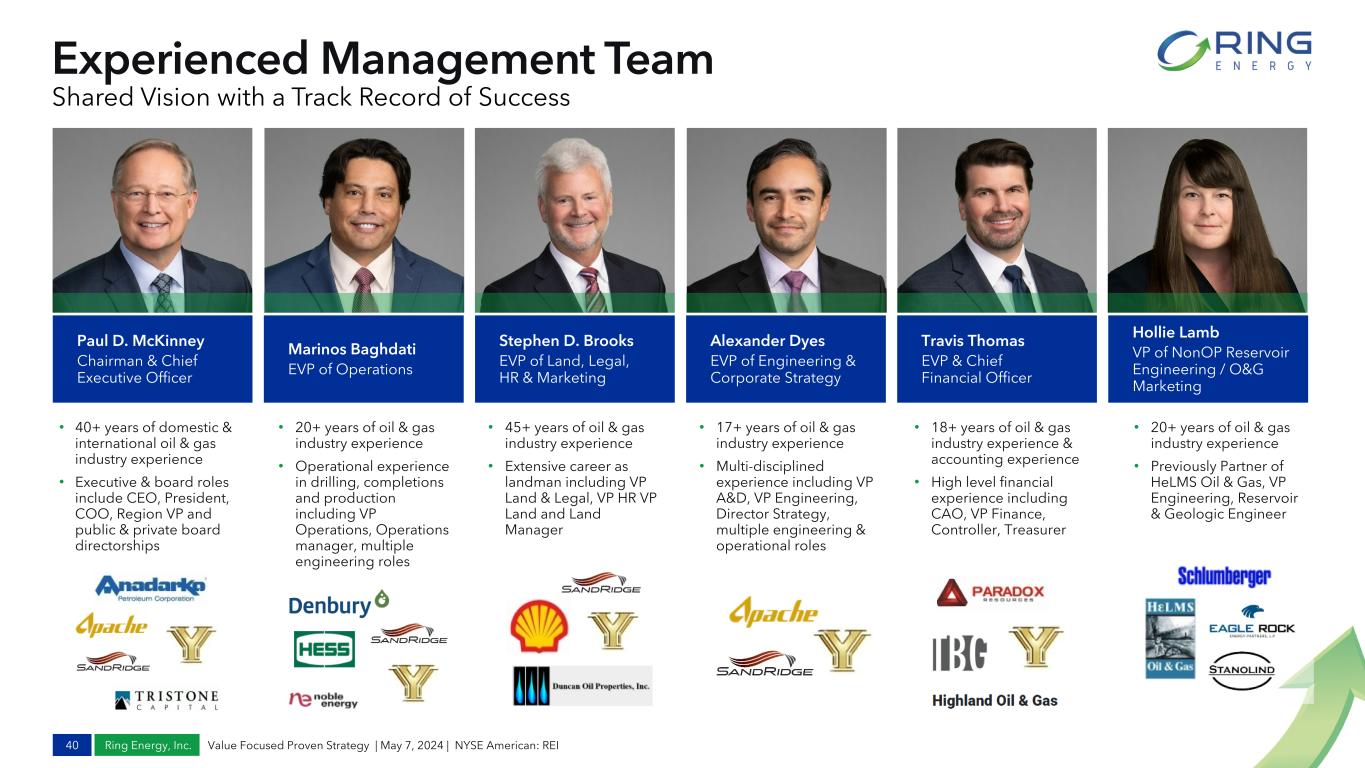 Ring Energy, Inc. Experienced Management Team 40 Value Focused Proven Strategy | May 7, 2024 | NYSE American: REI Shared Vision with a Track Record of Success • 40+ years of domestic & international oil & gas industry experience • Executive & board roles include CEO, President, COO, Region VP and public & private board directorships Paul D. McKinney Chairman & Chief Executive Officer Marinos Baghdati EVP of Operations Stephen D. Brooks EVP of Land, Legal, HR & Marketing Alexander Dyes EVP of Engineering & Corporate Strategy Travis Thomas EVP & Chief Financial Officer Hollie Lamb VP of NonOP Reservoir Engineering / O&G Marketing • 20+ years of oil & gas industry experience • Operational experience in drilling, completions and production including VP Operations, Operations manager, multiple engineering roles • 45+ years of oil & gas industry experience • Extensive career as landman including VP Land & Legal, VP HR VP Land and Land Manager • 17+ years of oil & gas industry experience • Multi-disciplined experience including VP A&D, VP Engineering, Director Strategy, multiple engineering & operational roles • 18+ years of oil & gas industry experience & accounting experience • High level financial experience including CAO, VP Finance, Controller, Treasurer • 20+ years of oil & gas industry experience • Previously Partner of HeLMS Oil & Gas, VP Engineering, Reservoir & Geologic Engineer