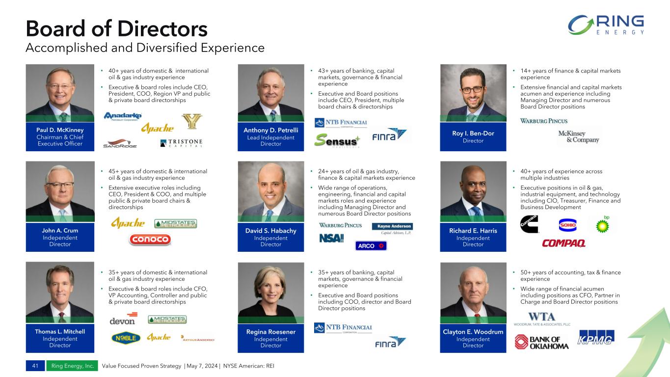 Ring Energy, Inc. Board of Directors 41 Value Focused Proven Strategy | May 7, 2024 | NYSE American: REI Accomplished and Diversified Experience • 40+ years of domestic & international oil & gas industry experience • Executive & board roles include CEO, President, COO, Region VP and public & private board directorships Paul D. McKinney Chairman & Chief Executive Officer • 43+ years of banking, capital markets, governance & financial experience • Executive and Board positions include CEO, President, multiple board chairs & directorships Anthony D. Petrelli Lead Independent Director • 14+ years of finance & capital markets experience • Extensive financial and capital markets acumen and experience including Managing Director and numerous Board Director positions Roy I. Ben-Dor Director • 45+ years of domestic & international oil & gas industry experience • Extensive executive roles including CEO, President & COO, and multiple public & private board chairs & directorships John A. Crum Independent Director • 24+ years of oil & gas industry, finance & capital markets experience • Wide range of operations, engineering, financial and capital markets roles and experience including Managing Director and numerous Board Director positions David S. Habachy Independent Director • 40+ years of experience across multiple industries • Executive positions in oil & gas, industrial equipment, and technology including CIO, Treasurer, Finance and Business Development Richard E. Harris Independent Director • 35+ years of domestic & international oil & gas industry experience • Executive & board roles include CFO, VP Accounting, Controller and public & private board directorships Thomas L. Mitchell Independent Director • 35+ years of banking, capital markets, governance & financial experience • Executive and Board positions including COO, director and Board Director positions Regina Roesener Independent Director • 50+ years of accounting, tax & finance experience • Wide range of financial acumen including positions as CFO, Partner in Charge and Board Director positions Clayton E. Woodrum Independent Director
