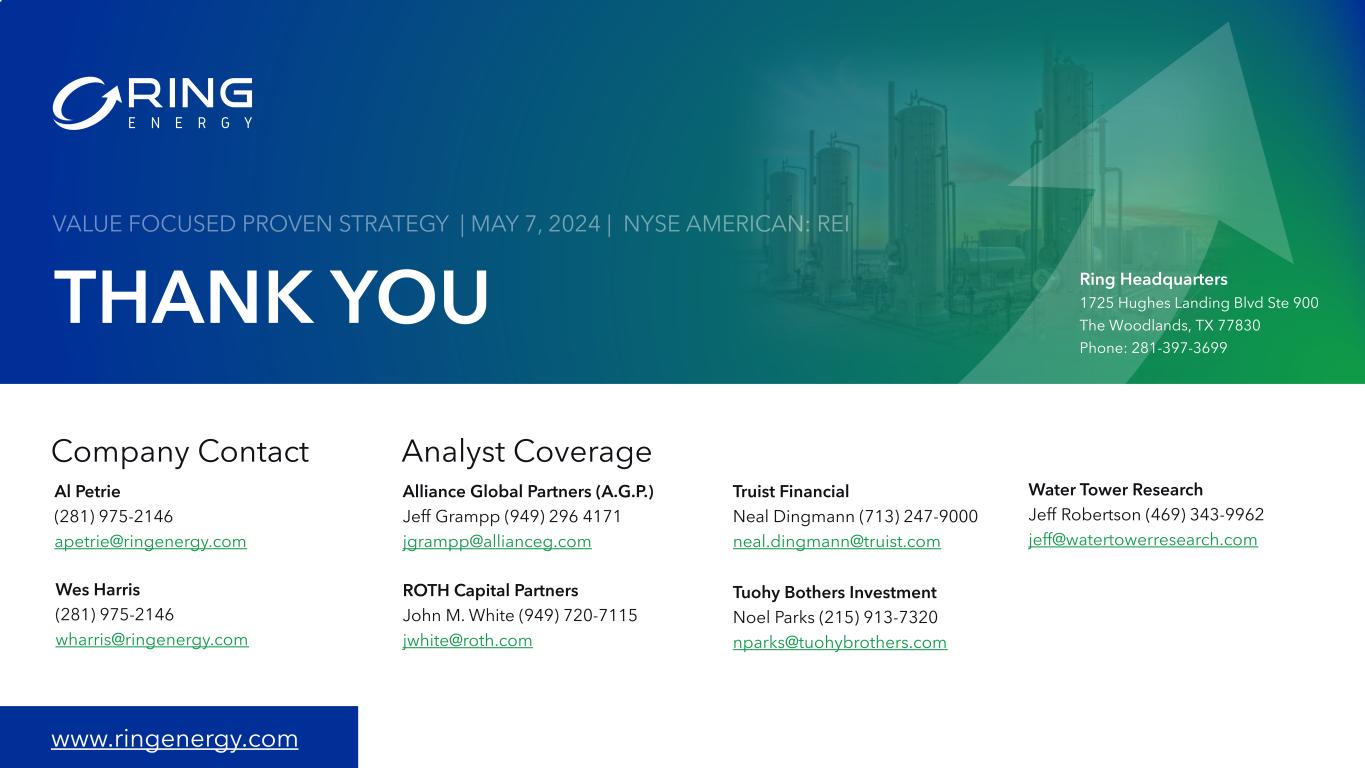 www.ringenergy.com VALUE FOCUSED PROVEN STRATEGY | MAY 7, 2024 | NYSE AMERICAN: REI THANK YOU Company Contact Al Petrie (281) 975-2146 apetrie@ringenergy.com Wes Harris (281) 975-2146 wharris@ringenergy.com Analyst Coverage Alliance Global Partners (A.G.P.) Jeff Grampp (949) 296 4171 jgrampp@allianceg.com ROTH Capital Partners John M. White (949) 720-7115 jwhite@roth.com Truist Financial Neal Dingmann (713) 247-9000 neal.dingmann@truist.com Tuohy Bothers Investment Noel Parks (215) 913-7320 nparks@tuohybrothers.com Water Tower Research Jeff Robertson (469) 343-9962 jeff@watertowerresearch.com Ring Headquarters 1725 Hughes Landing Blvd Ste 900 The Woodlands, TX 77830 Phone: 281-397-3699