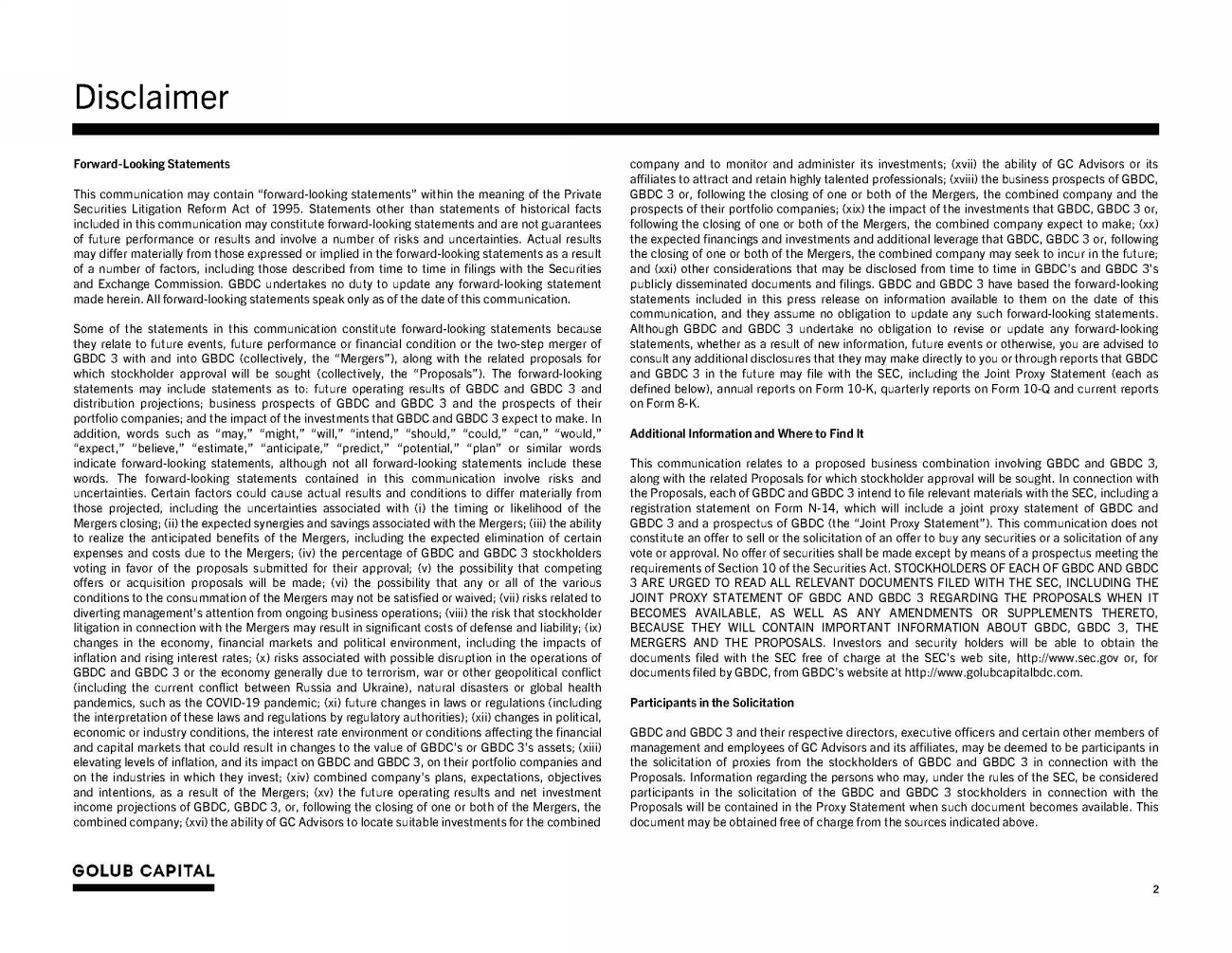 Disclaimer 2 company and to monitor and administer its investments ; (xvii) the ability of GC Advisors or its affiliates to attract and retain highly talented professionals ; (xviii) the business prospects of GBDC, GBDC 3 or, following the closing of one or both of the Mergers, the combined company and the prospects of their portfolio companies ; (xix) the impact of the investments that GBDC, GBDC 3 or, following the closing of one or both of the Mergers, the combined company expect to make ; (xx) the expected financings and investments and additional leverage that GBDC, GBDC 3 or, following the closing of one or both of the Mergers, the combined company may seek to incur in the future ; and (xxi) other considerations that may be disclosed from time to time in GBDC’s and GBDC 3 ’s publicly disseminated documents and filings . GBDC and GBDC 3 have based the forward - looking statements included in this press release on information available to them on the date of this communication, and they assume no obligation to update any such forward - looking statements . Although GBDC and GBDC 3 undertake no obligation to revise or update any forward - looking statements, whether as a result of new information, future events or otherwise, you are advised to consult any additional disclosures that they may make directly to you or through reports that GBDC and GBDC 3 in the future may file with the SEC, including the Joint Proxy Statement (each as defined below), annual reports on Form 10 - K, quarterly reports on Form 10 - Q and current reports on Form 8 - K . Additional Information and Where to Find It This communication relates to a proposed business combination involving GBDC and GBDC 3 , along with the related Proposals for which stockholder approval will be sought . In connection with the Proposals, each of GBDC and GBDC 3 intend to file relevant materials with the SEC, including a registration statement on Form N - 14 , which will include a joint proxy statement of GBDC and GBDC 3 and a prospectus of GBDC (the “Joint Proxy Statement”) . This communication does not constitute an offer to sell or the solicitation of an offer to buy any securities or a solicitation of any vote or approval . No offer of securities shall be made except by means of a prospectus meeting the requirements of Section 10 of the Securities Act . STOCKHOLDERS OF EACH OF GBDC AND GBDC 3 ARE URGED TO READ ALL RELEVANT DOCUMENTS FILED WITH THE SEC, INCLUDING THE JOINT PROXY STATEMENT OF GBDC AND GBDC 3 REGARDING THE PROPOSALS WHEN IT BECOMES AVAILABLE, AS WELL AS ANY AMENDMENTS OR SUPPLEMENTS THERETO, BECAUSE THEY WILL CONTAIN IMPORTANT INFORMATION ABOUT GBDC, GBDC 3 , THE MERGERS AND THE PROPOSALS . Investors and security holders will be able to obtain the documents filed with the SEC free of charge at the SEC’s web site, http : //www . sec . gov or, for documents filed by GBDC, from GBDC’s website at http : //www . golubcapitalbdc . com . Participants in the Solicitation GBDC and GBDC 3 and their respective directors, executive officers and certain other members of management and employees of GC Advisors and its affiliates, may be deemed to be participants in the solicitation of proxies from the stockholders of GBDC and GBDC 3 in connection with the Proposals . Information regarding the persons who may, under the rules of the SEC, be considered participants in the solicitation of the GBDC and GBDC 3 stockholders in connection with the Proposals will be contained in the Proxy Statement when such document becomes available . This document may be obtained free of charge from the sources indicated above . Forward - Looking Statements This communication may contain “forward - looking statements” within the meaning of the Private Securities Litigation Reform Act of 1995 . Statements other than statements of historical facts included in this communication may constitute forward - looking statements and are not guarantees of future performance or results and involve a number of risks and uncertainties . Actual results may differ materially from those expressed or implied in the forward - looking statements as a result of a number of factors, including those described from time to time in filings with the Securities and Exchange Commission . GBDC undertakes no duty to update any forward - looking statement made herein . All forward - looking statements speak only as of the date of this communication . Some of the statements in this communication constitute forward - looking statements because they relate to future events, future performance or financial condition or the two - step merger of GBDC 3 with and into GBDC (collectively, the “Mergers”), along with the related proposals for which stockholder approval will be sought (collectively, the “Proposals”) . The forward - looking statements may include statements as to : future operating results of GBDC and GBDC 3 and distribution projections ; business prospects of GBDC and GBDC 3 and the prospects of their portfolio companies ; and the impact of the investments that GBDC and GBDC 3 expect to make . In addition, words such as “may,” “might,” “will,” “intend,” “should,” “could,” “can,” “would,” “expect,” “believe,” “estimate,” “anticipate,” “predict,” “potential,” “plan” or similar words indicate forward - looking statements, although not all forward - looking statements include these words . The forward - looking statements contained in this communication involve risks and uncertainties . Certain factors could cause actual results and conditions to differ materially from those projected, including the uncertainties associated with (i) the timing or likelihood of the Mergers closing ; (ii) the expected synergies and savings associated with the Mergers ; (iii) the ability to realize the anticipated benefits of the Mergers, including the expected elimination of certain expenses and costs due to the Merg