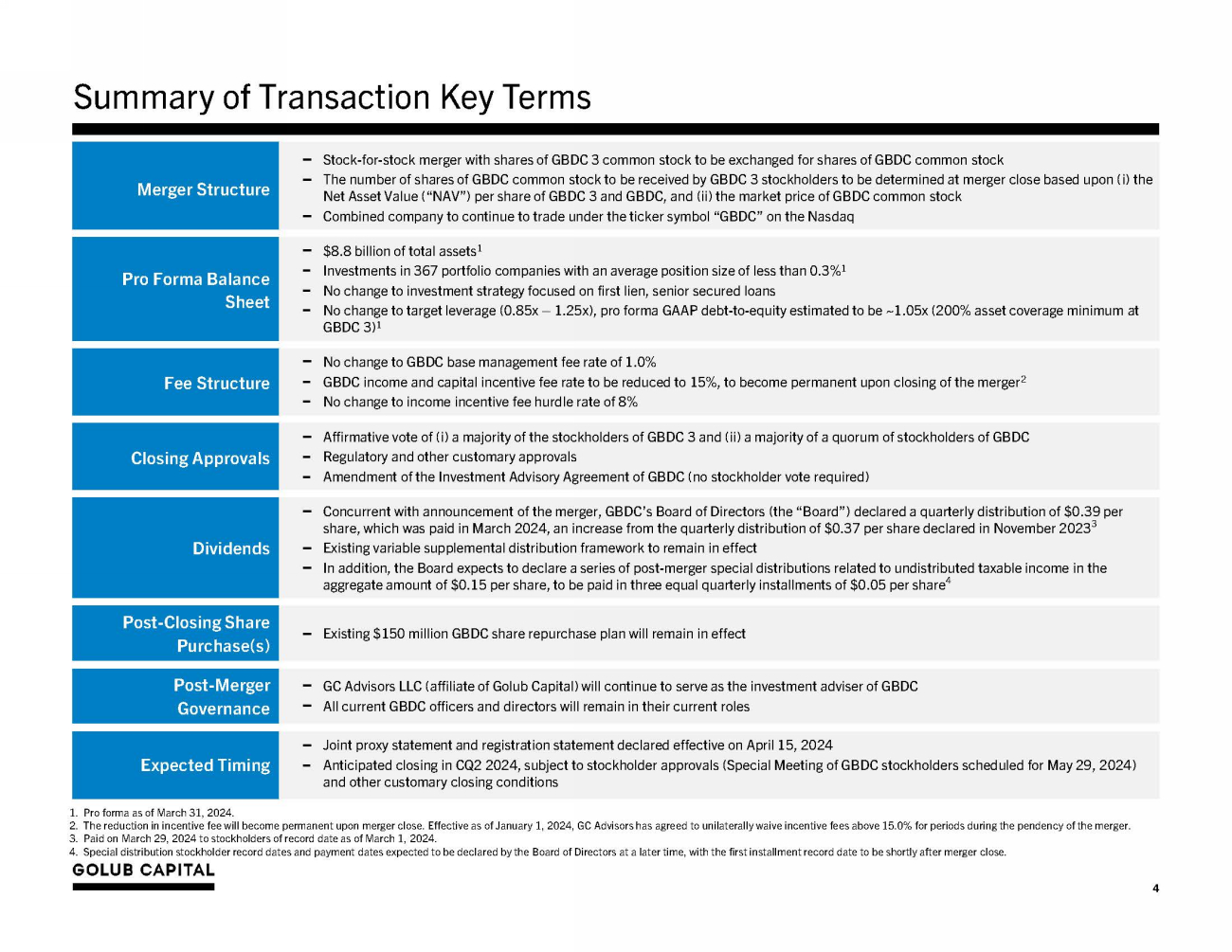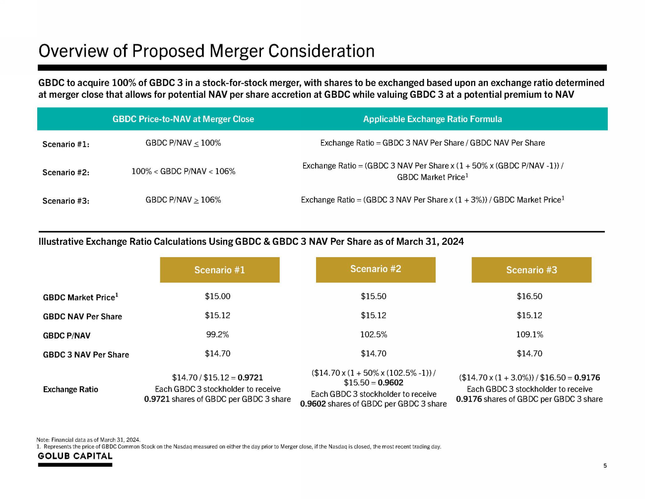 Merger Structure − Stock - for - stock merger with shares of GBDC 3 common stock to be exchanged for shares of GBDC common stock − The number of shares of GBDC common stock to be received by GBDC 3 stockholders to be determined at merger close based upon (i) the Net Asset Value (“NAV”) per share of GBDC 3 and GBDC, and (ii) the market price of GBDC common stock − Combined company to continue to trade under the ticker symbol “GBDC” on the Nasdaq Pro Forma Balance S h ee t − $8.8 billion of total assets 1 − Investments in 367 portfolio companies with an average position size of less than 0.3% 1 − No change to investment strategy focused on first lien, senior secured loans − No change to target leverage (0.85x – 1.25x), pro forma GAAP debt - to - equity estimated to be ~1.05x (200% asset coverage minimum at GBDC 3) 1 Fee Structure − No change to GBDC base management fee rate of 1.0% − GBDC income and capital incentive fee rate to be reduced to 15%, to become permanent upon closing of the merger 2 − No change to income incentive fee hurdle rate of 8% Closing Approvals − Affirmative vote of (i) a majority of the stockholders of GBDC 3 and (ii) a majority of a quorum of stockholders of GBDC − Regulatory and other customary approvals − Amendment of the Investment Advisory Agreement of GBDC (no stockholder vote required) D i v id e nd s − Concurrent with announcement of the merger, GBDC’s Board of Directors (the “Board”) declared a quarterly distribution of $0.39 per share, which was paid in March 2024, an increase from the quarterly distribution of $0.37 per share declared in November 2023 3 − Existing variable supplemental distribution framework to remain in effect − In addition, the Board expects to declare a series of post - merger special distributions related to undistributed taxable income in the aggregate amount of $0.15 per share, to be paid in three equal quarterly installments of $0.05 per share 4 Post - Closing Share P u r chas e ( s ) − Existing $150 million GBDC share repurchase plan will remain in effect Po s t - M e r g e r G o ve r nan c e − GC Advisors LLC (affiliate of Golub Capital) will continue to serve as the investment adviser of GBDC − All current GBDC officers and directors will remain in their current roles Expected Timing − Joint proxy statement and registration statement declared effective on April 15, 2024 − Anticipated closing in CQ2 2024, subject to stockholder approvals (Special Meeting of GBDC stockholders scheduled for May 29, 2024) and other customary closing conditions 4 Summary of Transaction Key Terms 1. Pro forma as of March 31, 2024. 2. The reduction in incentive fee will become permanent upon merger close. Effective as of January 1, 2024, GC Advisors has agreed to unilaterally waive incentive fees above 15.0% for periods during the pendency of the merger. 3. Paid on March 29, 2024 to stockholders of record date as of March 1, 2024. 4. Special distribution stockholder record dates and payment dates expected to be declared by the Board of Directors at a later time, with the first installment record date to be shortly after merger close.