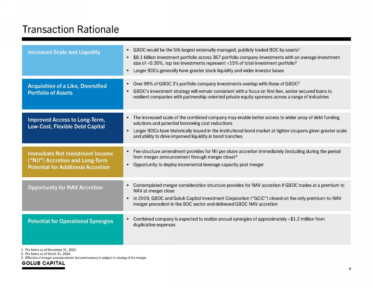 GBDC to acquire 100% of GBDC 3 in a stock - for - stock merger, with shares to be exchanged based upon an exchange ratio determined at merger close that allows for potential NAV per share accretion at GBDC while valuing GBDC 3 at a potential premium to NAV Overview of Proposed Merger Consideration Illustrative Exchange Ratio Calculations Using GBDC & GBDC 3 NAV Per Share as of March 31, 2024 1. Represents the price of GBDC Common Stock on the Nasdaq measured on either the day prior to Merger close, if the Nasdaq is closed, the most recent trading day. 5 GBDC Price - to - NAV at Merger Close Applicable Exchange Ratio Formula Scenario #1: GBDC P/NAV < 100% Exchange Ratio = GBDC 3 NAV Per Share / GBDC NAV Per Share Scenario #2: 100% < GBDC P/NAV < 106% Exchange Ratio = (GBDC 3 NAV Per Share x (1 + 50% x (GBDC P/NAV - 1)) / GBDC Market Price 1 Scenario #3: GBDC P/NAV > 106% Exchange Ratio = (GBDC 3 NAV Per Share x (1 + 3%)) / GBDC Market Price 1 Scenario #1 Scenario #2 GBDC Market Price 1 $15.00 $15.50 $16.50 GBDC NAV Per Share $15.12 $15.12 $15.12 GBDC P/NAV 99.2% 102.5% 109.1% GBDC 3 NAV Per Share $14.70 $14.70 $14.70 Exchange Ratio $14.70 / $15.12 = 0.9721 Each GBDC 3 stockholder to receive 0.9721 shares of GBDC per GBDC 3 share ($14.70 x (1 + 50% x (102.5% - 1)) / $15.50 = 0.9602 Each GBDC 3 stockholder to receive 0.9602 shares of GBDC per GBDC 3 share ($14.70 x (1 + 3.0%)) / $16.50 = 0.9176 Each GBDC 3 stockholder to receive 0.9176 shares of GBDC per GBDC 3 share Note: Financial data as of March 31, 2024. Scenario #3