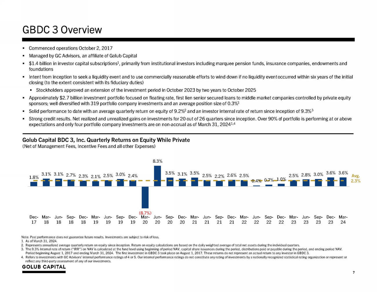 GBDC 3 Overview Note: Past performance does not guarantee future results. Investments are subject to risk of loss. 1. As of March 31, 2024. 2. Represents annualized average quarterly return on equity since inception. Return on equity calculations are based on the daily weighted average of total net assets during the individual quarters. 3. The 9.3% Internal rate of return (“IRR”) on NAV is calculated at the fund level using beginning of period NAV, capital share issuances during the period, distributions paid or payable during the period, and ending period NAV. Period beginning August 1, 2017 and ending March 31, 2024. The first investment in GBDC 3 took place on August 1, 2017. These returns do not represent an actual return to any investor in GBDC 3. 4. Refers to investments with GC Advisors’ internal performance ratings of 4 or 5. Our internal performance ratings do not constitute any rating of investments by a nationally recognized statistical rating organization or represent or ▪ Commenced operations October 2, 2017 ▪ Managed by GC Advisors, an affiliate of Golub Capital ▪ $1.4 billion in investor capital subscriptions 1 , primarily from institutional investors including marquee pension funds, insurance companies, endowments and foundations ▪ Intent from inception to seek a liquidity event and to use commercially reasonable efforts to wind down if no liquidity event occurred within six years of the initial closing (to the extent consistent with its fiduciary duties) ▪ Stockholders approved an extension of the investment period in October 2023 by two years to October 2025 ▪ Approximately $2.7 billion investment portfolio focused on floating rate, first lien senior secured loans to middle market companies controlled by private equity sponsors; well diversified with 319 portfolio company investments and an average position size of 0.3% 1 ▪ Solid performance to date with an average quarterly return on equity of 9.2% 2 and an investor internal rate of return since inception of 9.3% 3 ▪ Strong credit results. Net realized and unrealized gains on investments for 20 out of 26 quarters since inception. Over 90% of portfolio is performing at or above expectations and only four portfolio company investments are on non - accrual as of March 31, 2024 1,4 Golub Capital BDC 3, Inc. Quarterly Returns on Equity While Private (Net of Management Fees, Incentive Fees and all other Expenses) 8.3% Avg. 2.3% 1.8% 3.1% 3.1% 2.7% 2.3% 2.1% 2.5% 3.0% 2.4% reflect any third - party assessment of any of our investments. 7 (8.7%) Dec - Mar - Jun - Sep - Dec - Mar - Jun - Sep - Dec - Mar - Jun - 17 18 18 18 18 19 19 19 19 20 20 3.5% 3.1% 3.5% 2.5% 2.2% 2.6% 2.5% 0.4% 0.7% 1.0% 2.5% 2.8% 3.0% 3.6% 3.6% Sep - Dec - Mar - Jun - Sep - Dec - Mar - 20 20 21 21 21 21 22 Jun - Sep - Dec - Mar - Jun - Sep - Dec - Mar - 22 22 22 23 23 23 23 24