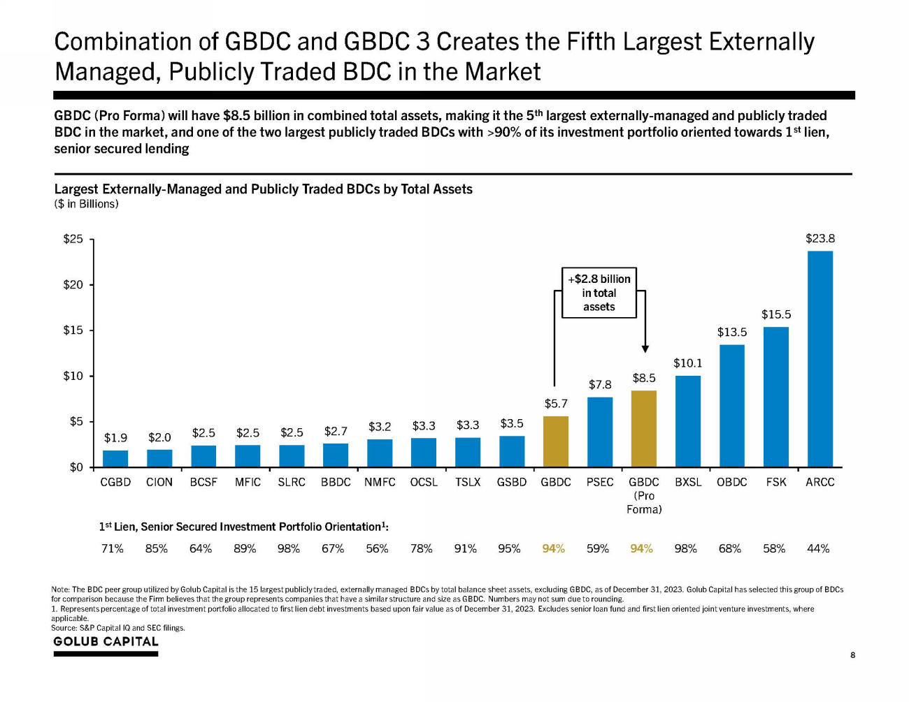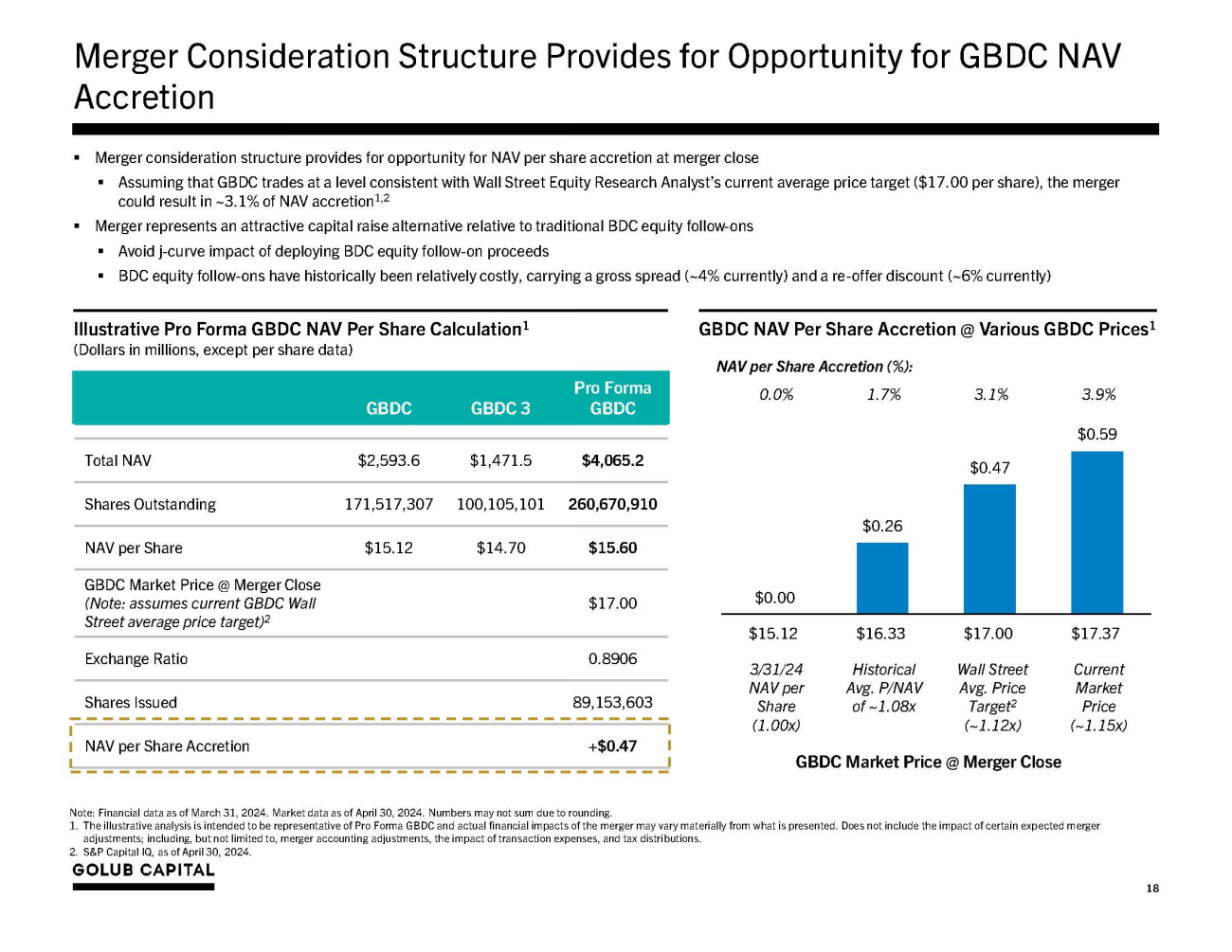 Transaction Rationale 3. Effective at merger announcement but permanency is subject to closing of the merger. 6 ▪ GBDC would be the 5th largest externally managed, publicly traded BDC by assets 1 ▪ $8.1 billion investment portfolio across 367 portfolio company investments with an average investment size of <0.30%, top ten investments represent <15% of total investment portfolio 2 ▪ Larger BDCs generally have greater stock liquidity and wider investor bases Increased Scale and Liquidity ▪ Over 99% of GBDC 3’s portfolio company investments overlap with those of GBDC 2 ▪ GBDC’s investment strategy will remain consistent with a focus on first lien, senior secured loans to resilient companies with partnership - oriented private equity sponsors across a range of industries Acquisition of a Like, Diversified Portfolio of Assets ▪ The increased scale of the combined company may enable better access to wider array of debt funding solutions and potential borrowing cost reductions ▪ Larger BDCs have historically issued in the institutional bond market at tighter coupons given greater scale and ability to drive improved liquidity in bond tranches Improved Access to Long - Term, Low - Cost, Flexible Debt Capital ▪ Combined company is expected to realize annual synergies of approximately ~$1.2 million from duplicative expenses Potential for Operational Synergies ▪ Contemplated merger consideration structure provides for NAV accretion if GBDC trades at a premium to NAV at merger close ▪ In 2019, GBDC and Golub Capital Investment Corporation (“GCIC”) closed on the only premium - to - NAV merger precedent in the BDC sector and delivered GBDC NAV accretion Opportunity for NAV Accretion ▪ Fee structure amendment provides for NII per share accretion immediately (including during the period from merger announcement through merger close) 3 ▪ Opportunity to deploy incremental leverage capacity post merger Immediate Net Investment Income (“NII”) Accretion and Long - Term Potential for Additional Accretion 1. Pro forma as of December 31, 2023. 2. Pro forma as of March 31, 2024.
