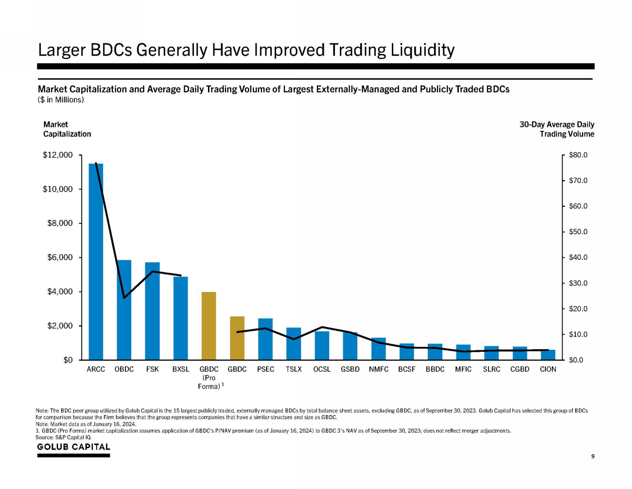 Combination of GBDC and GBDC 3 Creates the Fifth Largest Externally Managed, Publicly Traded BDC in the Market $1 . 9 $2 . 0 $2 . 5 $2 . 5 $ 2 . 5 $2 . 7 $3 . 2 $3 . 3 $3 . 3 $3 . 5 $ 5 . 7 $ 7 . 8 $8 . 5 $10 . 1 $13 . 5 $15 . 5 $23 . 8 $0 $5 $10 $15 $20 $25 C G BD C I O N B C S F M F IC S LR C B B DC N M F C O CSL T S LX G S B D G BD C PS E C G BD C B X S L (Pro F o r m a) O BD C F S K AR CC GBDC (Pro Forma) will have $ 8 . 5 billion in combined total assets, making it the 5 th largest externally - managed and publicly traded BDC in the market, and one of the two largest publicly traded BDCs with > 90 % of its investment portfolio oriented towards 1 st lien, senior secured lending Largest Externally - Managed and Publicly Traded BDCs by Total Assets ( $ in Billions) Note: The BDC peer group utilized by Golub Capital is the 15 largest publicly traded, externally managed BDCs by total balance sheet assets, excluding GBDC, as of December 31, 2023. Golub Capital has selected this group of BDCs for comparison because the Firm believes that the group represents companies that have a similar structure and size as GBDC. Numbers may not sum due to rounding. 1. Represents percentage of total investment portfolio allocated to first lien debt investments based upon fair value as of December 31, 2023. Excludes senior loan fund and first lien oriented joint venture investments, where applicable. +$2.8 billion in total assets Source: S&P Capital IQ and SEC filings. 8 1 st Lien, Senior Secured Investment Portfolio Orientation 1 : 71% 85% 64% 89% 98% 67% 56% 78% 91% 95% 94% 59% 94% 98% 68% 58% 44%