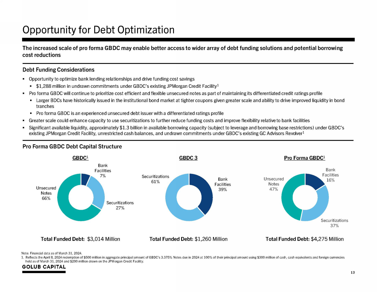 Healthcare Providers and Services 7.5% S p e c ia lty Retail 5.6% Insuran c e 5.2% Automob ile s 5.3% Other 48 . 9 % Risk Ratings 4 - 5 88.3% Software 27.5% Senior S e c ure d 8% One Stop 85% Risk Ratings 1 - 2 0.4% Risk Rating 3 11.3% Equity and Other Investments 5% Junior Debt 1 % Pro Forma Portfolio Remains Similar to GBDC Today GBDC GBDC 3 Pro Forma GBDC Asset Mix: Senior Secured 8% 8% 8% One Stop 85% 86% 85% Junior Debt 1 1% 1% 1% Equity and Other Investments 6% 5% 6% Total 100% 100% 100% Internal Performance Ratings 2 : Internal Performance Ratings 4 - 5 87.2% 90.5% 88.3% Internal Performance Rating 3 12.3% 9.4% 11.3% Internal Performance Ratings 1 - 2 0.5% 0.1% 0.4% Total 100.0% 100 . 0 % 100.0% Non - Accrual Investments: Non - accrual Investments 3 1.1% 0.1% 0.8% Industry 4 : Software 27.1% 28.2% 27.5% Healthcare Providers and Services 8.1% 6.3% 7.5% Specialty Retail 5.8% 5.1% 5.6% Automobiles 5.1% 5.8% 5.3% Insurance 4.8% 6.0% 5.2% Other 49.1% 48.7% 48.9% Total 100.0% 100 . 0 % 100.0% Note: Financial data as of March 31, 2024. Figures may not sum to 100% due to rounding. 1. Junior Debt is comprised of subordinated debt and second lien loans. 2. Please see Internal Performance Ratings set forth in the section captioned “Portfolio Composition, Investment Activity and Yield” in our annual report on form 10 - K. 3. Non - accrual investments as a percentage of total debt investments at fair value. Key Portfolio Metrics (% of Total Investment Portfolio at Fair Value) 4. Based on S&P 2018 industry code. The largest industries represented as a percentage of the portfolio at fair value are labeled. 12 93% First Lien