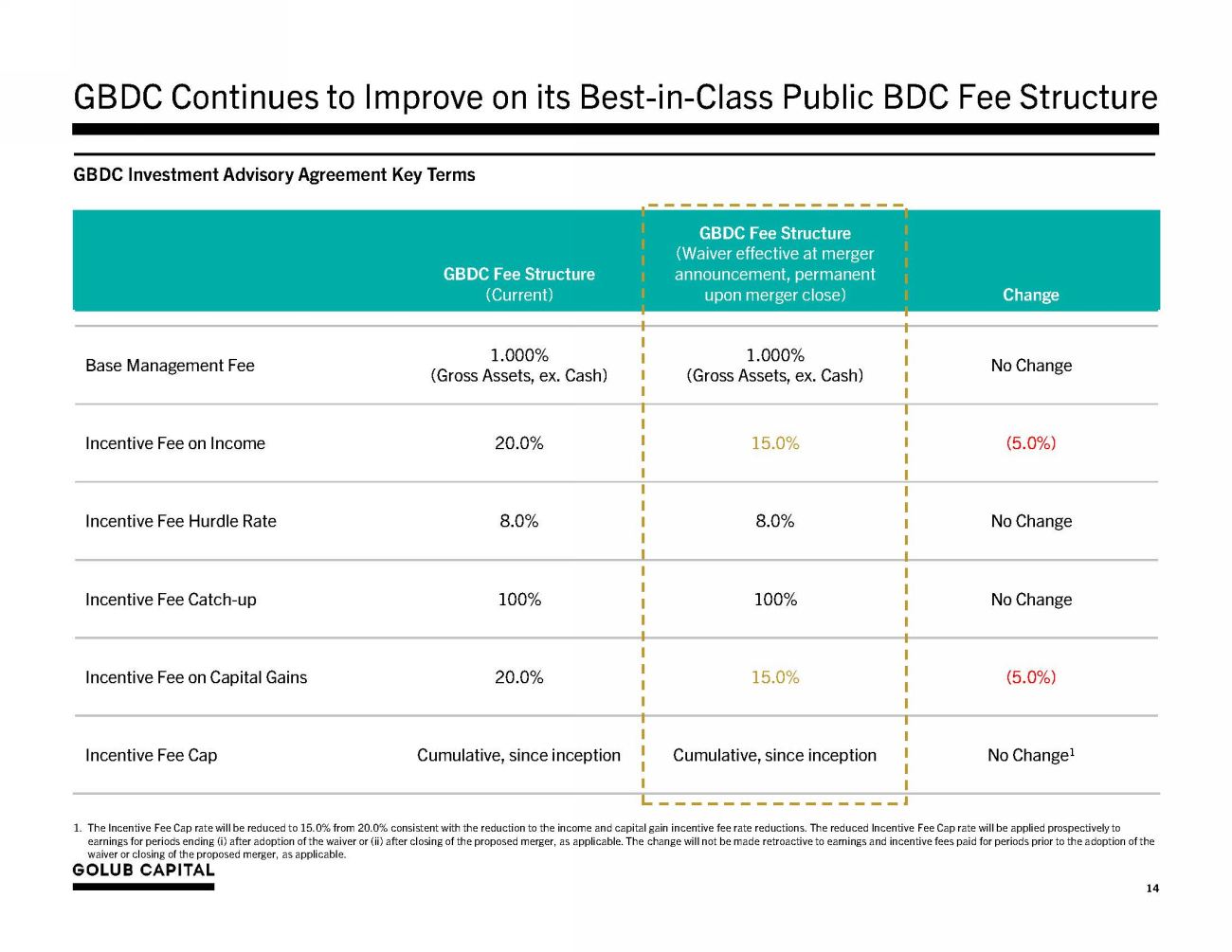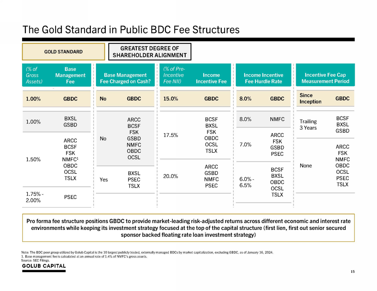 GBDC Continues to Improve on its Best - in - Class Public BDC Fee Structure GBDC Investment Advisory Agreement Key Terms GBDC Fee Structure (Current) GBDC Fee Structure (Waiver effective at merger announcement, permanent upon merger close) Change Base Management Fee 1.000% (Gross Assets, ex. Cash) 1.000% (Gross Assets, ex. Cash) No Change Incentive Fee on Income 20.0% 15.0% (5.0%) Incentive Fee Hurdle Rate 8.0% 8.0% No Change Incentive Fee Catch - up 100% 100% No Change Incentive Fee on Capital Gains 20.0% 15.0% (5.0%) Incentive Fee Cap Cumulative, since inception Cumulative, since inception No Change 1 waiver or closing of the proposed merger, as applicable. 14 1. The Incentive Fee Cap rate will be reduced to 15.0% from 20.0% consistent with the reduction to the income and capital gain incentive fee rate reductions. The reduced Incentive Fee Cap rate will be applied prospectively to earnings for periods ending (i) after adoption of the waiver or (ii) after closing of the proposed merger, as applicable. The change will not be made retroactive to earnings and incentive fees paid for periods prior to the adoption of the