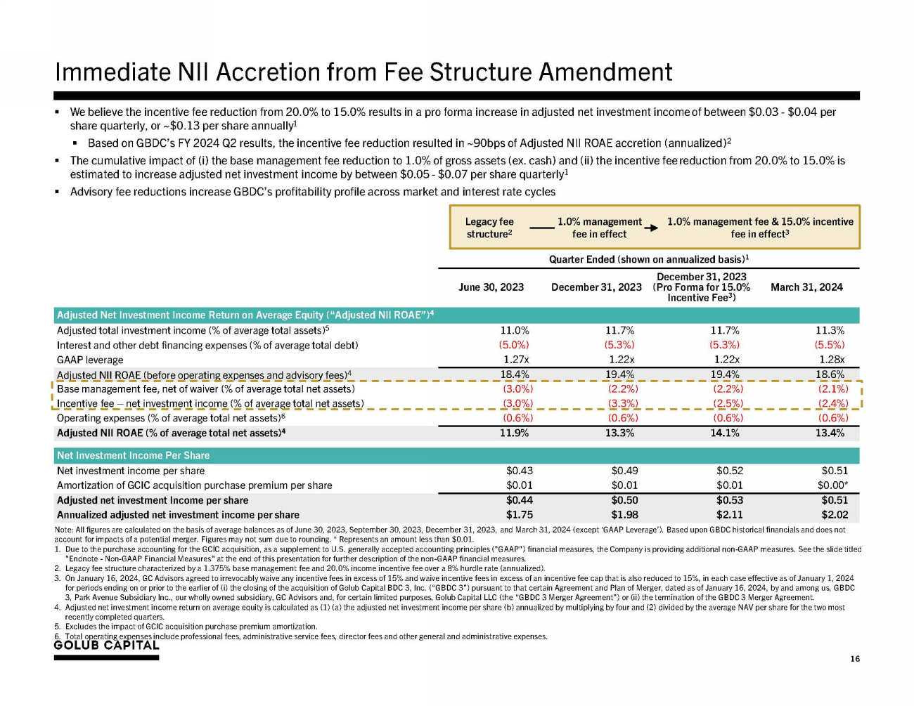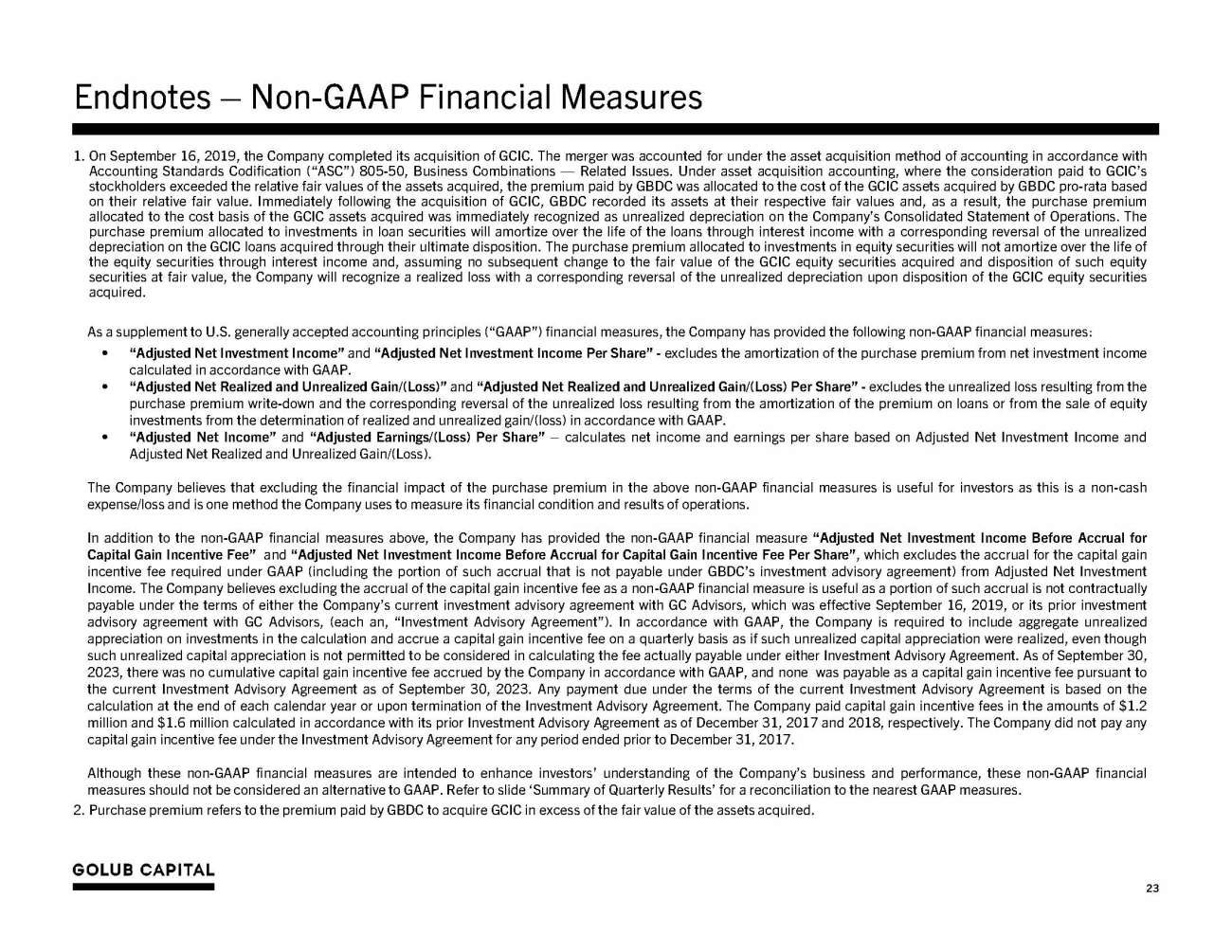 Endnotes – Non - GAAP Financial Measures 23 1. On September 16 , 2019 , the Company completed its acquisition of GCIC . The merger was accounted for under the asset acquisition method of accounting in accordance with Accounting Standards Codification (“ASC”) 805 - 50 , Business Combinations — Related Issues . Under asset acquisition accounting, where the consideration paid to GCIC’s stockholders exceeded the relative fair values of the assets acquired, the premium paid by GBDC was allocated to the cost of the GCIC assets acquired by GBDC pro - rata based on their relative fair value . Immediately following the acquisition of GCIC, GBDC recorded its assets at their respective fair values and, as a result, the purchase premium allocated to the cost basis of the GCIC assets acquired was immediately recognized as unrealized depreciation on the Company's Consolidated Statement of Operations . The purchase premium allocated to investments in loan securities will amortize over the life of the loans through interest income with a corresponding reversal of the unrealized depreciation on the GCIC loans acquired through their ultimate disposition . The purchase premium allocated to investments in equity securities will not amortize over the life of the equity securities through interest income and, assuming no subsequent change to the fair value of the GCIC equity securities acquired and disposition of such equity securities at fair value, the Company will recognize a realized loss with a corresponding reversal of the unrealized depreciation upon disposition of the GCIC equity securities acquired . As a supplement to U . S . generally accepted accounting principles (“GAAP”) financial measures, the Company has provided the following non - GAAP financial measures : • “Adjusted Net Investment Income” and “Adjusted Net Investment Income Per Share” - excludes the amortization of the purchase premium from net investment income calculated in accordance with GAAP . • “Adjusted Net Realized and Unrealized Gain/(Loss)” and “Adjusted Net Realized and Unrealized Gain/(Loss) Per Share” - excludes the unrealized loss resulting from the purchase premium write - down and the corresponding reversal of the unrealized loss resulting from the amortization of the premium on loans or from the sale of equity investments from the determination of realized and unrealized gain/(loss) in accordance with GAAP . • “Adjusted Net Income” and “Adjusted Earnings/(Loss) Per Share” – calculates net income and earnings per share based on Adjusted Net Investment Income and Adjusted Net Realized and Unrealized Gain/(Loss) . The Company believes that excluding the financial impact of the purchase premium in the above non - GAAP financial measures is useful for investors as this is a non - cash expense/loss and is one method the Company uses to measure its financial condition and results of operations . In addition to the non - GAAP financial measures above, the Company has provided the non - GAAP financial measure “Adjusted Net Investment Income Before Accrual for Capital Gain Incentive Fee” and “Adjusted Net Investment Income Before Accrual for Capital Gain Incentive Fee Per Share” , which excludes the accrual for the capital gain incentive fee required under GAAP (including the portion of such accrual that is not payable under GBDC’s investment advisory agreement) from Adjusted Net Investment Income . The Company believes excluding the accrual of the capital gain incentive fee as a non - GAAP financial measure is useful as a portion of such accrual is not contractually payable under the terms of either the Company’s current investment advisory agreement with GC Advisors, which was effective September 16 , 2019 , or its prior investment advisory agreement with GC Advisors, (each an, “Investment Advisory Agreement”) . In accordance with GAAP, the Company is required to include aggregate unrealized appreciation on investments in the calculation and accrue a capital gain incentive fee on a quarterly basis as if such unrealized capital appreciation were realized, even though such unrealized capital appreciation is not permitted to be considered in calculating the fee actually payable under either Investment Advisory Agreement . As of September 30 , 2023 , there was no cumulative capital gain incentive fee accrued by the Company in accordance with GAAP, and none was payable as a capital gain incentive fee pursuant to the current Investment Advisory Agreement as of September 30 , 2023 . Any payment due under the terms of the current Investment Advisory Agreement is based on the calculation at the end of each calendar year or upon termination of the Investment Advisory Agreement . The Company paid capital gain incentive fees in the amounts of $ 1 . 2 million and $ 1 . 6 million calculated in accordance with its prior Investment Advisory Agreement as of December 31 , 2017 and 2018 , respectively . The Company did not pay any capital gain incentive fee under the Investment Advisory Agreement for any period ended prior to December 31 , 2017 . Although these non - GAAP financial measures are intended to enhance investors’ understanding of the Company’s business and performance, these non - GAAP financial measures should not be considered an alternative to GAAP. Refer to slide ‘Summary of Quarterly Results’ for a reconciliation to the nearest GAAP measures. 2. Purchase premium refers to the premium paid by GBDC to acquire GCIC in excess of the fair value of the assets acquired.