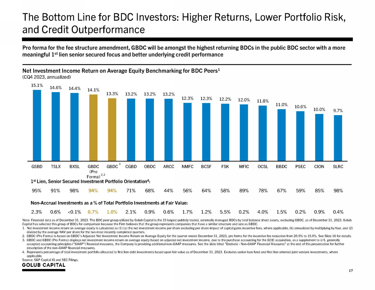 Immediate NII Accretion from Fee Structure Amendment Note : All figures are calculated on the basis of average balances as of June 30 , 2023 , September 30 , 2023 , December 31 , 2023 , and March 31 , 2024 (except ‘GAAP Leverage’) . Based upon GBDC historical financials and does not account for impacts of a potential merger . Figures may not sum due to rounding . * Represents an amount less than $ 0 . 01 . 1. Due to the purchase accounting for the GCIC acquisition, as a supplement to U . S . generally accepted accounting principles ("GAAP") financial measures, the Company is providing additional non - GAAP measures . See the slide titled "Endnote - Non - GAAP Financial Measures" at the end of this presentation for further description of the non - GAAP financial measures . 2. Legacy fee structure characterized by a 1 . 375 % base management fee and 20 . 0 % income incentive fee over a 8 % hurdle rate (annualized) . 3. On January 16 , 2024 , GC Advisors agreed to irrevocably waive any incentive fees in excess of 15 % and waive incentive fees in excess of an incentive fee cap that is also reduced to 15 % , in each case effective as of January 1 , 2024 for periods ending on or prior to the earlier of (i) the closing of the acquisition of Golub Capital BDC 3 , Inc . (“GBDC 3 ”) pursuant to that certain Agreement and Plan of Merger, dated as of January 16 , 2024 , by and among us, GBDC 3 , Park Avenue Subsidiary Inc . , our wholly owned subsidiary, GC Advisors and, for certain limited purposes, Golub Capital LLC (the “GBDC 3 Merger Agreement”) or (ii) the termination of the GBDC 3 Merger Agreement . 4. Adjusted net investment income return on average equity is calculated as ( 1 ) (a) the adjusted net investment income per share (b) annualized by multiplying by four and ( 2 ) divided by the average NAV per share for the two most recently completed quarters . 5. Excludes the impact of GCIC acquisition purchase premium amortization . ▪ We believe the incentive fee reduction from 20.0% to 15.0% results in a pro forma increase in adjusted net investment income of between $0.03 - $0.04 per share quarterly, or ~$0.13 per share annually 1 ▪ Based on GBDC’s FY 2024 Q2 results, the incentive fee reduction resulted in ~90bps of Adjusted NII ROAE accretion (annualized) 2 ▪ The cumulative impact of (i) the base management fee reduction to 1.0% of gross assets (ex. cash) and (ii) the incentive fee reduction from 20.0% to 15.0% is estimated to increase adjusted net investment income by between $0.05 - $0.07 per share quarterly 1 ▪ Advisory fee reductions increase GBDC’s profitability profile across market and interest rate cycles Legacy fee 1.0% management 1.0% management fee & 15.0% incentive structure 2 fee in effect fee in effect 3 Quarter Ended (shown on annualized basis) 1 June 30, 2023 December 31, 2023 December 31, 2023 (Pro Forma for 15.0% Incentive Fee 3 ) March 31, 2024 Adjusted Net Investment Income Return on Average Equity (“Adjusted NII ROAE”) 4 Adjusted total investment income (% of average total assets) 5 11.0% 11.7% 1 1.7% 11.3% Interest and other debt financing expenses (% of average total debt) (5.0%) (5.3%) (5.3%) (5.5%) GAAP leverage 1.27x 1.22x 1.22x 1.28x Adjusted NII ROAE (before operating expenses and advisory fees) 4 18.4% 19.4% 1 9.4% 18.6% Base management fee, net of waiver (% of average total net assets) (3.0%) (2.2%) (2.2%) (2.1%) Incentive fee – net investment income (% of average total net assets) (3.0%) (3.3%) (2.5%) (2.4%) Operating expenses (% of average total net assets) 6 (0.6%) (0.6%) (0.6%) (0.6%) Adjusted NII ROAE (% of average total net assets) 4 11.9% 13.3% 1 4.1% 13.4% Net Investment Income Per Share Net investment income per share $0.43 $0.49 $0.52 $0.51 Amortization of GCIC acquisition purchase premium per share $0.01 $0.01 $0.01 $0.00* Adjusted net investment Income per share $0.44 $0.50 $0.53 $0.51 Annualized adjusted net investment income per share $1.75 $1.98 $2.11 $2.02 6. Total operating expenses include professional fees, administrative service fees, director fees and other general and administrative expenses. 16