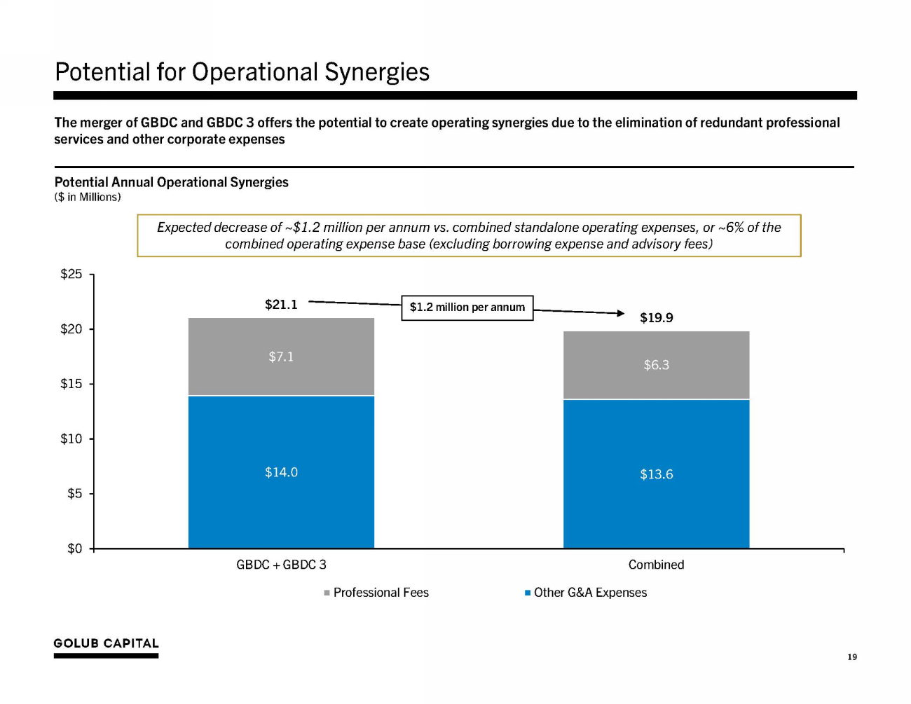 Merger Consideration Structure Provides for Opportunity for GBDC NAV Accretion Illustrative Pro Forma GBDC NAV Per Share Calculation 1 (Dollars in millions, except per share data) GBDC NAV Per Share Accretion @ Various GBDC Prices 1 NAV per Share Accretion (%): GBDC GBDC 3 Pro Forma GBDC Total NAV $2,593.6 $1,471.5 $4,065.2 Shares Outstanding 171,517,307 100,105,101 260,670,910 NAV per Share $15.12 $14.70 $15.60 GBDC Market Price @ Merger Close (Note: assumes current GBDC Wall Street average price target) 2 $17.00 Exchange Ratio 0.8906 Shares Issued 89,153,603 NAV per Share Accretion +$0.47 Note: Financial data as of March 31, 2024. Market data as of April 30, 2024. Numbers may not sum due to rounding. 1. The illustrative analysis is intended to be representative of Pro Forma GBDC and actual financial impacts of the merger may vary materially from what is presented. Does not include the impact of certain expected merger adjustments; including, but not limited to, merger accounting adjustments, the impact of transaction expenses, and tax distributions. 2. S&P Capital IQ, as of April 30, 2024. 0.0% 1.7% 3.1% 3.9% $0 . 59 $0.47 $0.26 $0.00 $15.12 $16.33 $17.00 $17 . 37 3/31/24 Historical Wall Street C u rr ent NAV per Avg. P/NAV Avg. Price Ma r k et Share (1.00x) of ~1.08x Target 2 (~1.12x) Price ( ~1 . 15 x ) 18 GBDC Market Price @ Merger Close ▪ Merger consideration structure provides for opportunity for NAV per share accretion at merger close ▪ Assuming that GBDC trades at a level consistent with Wall Street Equity Research Analyst’s current average price target ($17.00 per share), the merger could result in ~3.1% of NAV accretion 1,2 ▪ Merger represents an attractive capital raise alternative relative to traditional BDC equity follow - ons ▪ Avoid j - curve impact of deploying BDC equity follow - on proceeds ▪ BDC equity follow - ons have historically been relatively costly, carrying a gross spread (~4% currently) and a re - offer discount (~6% currently)
