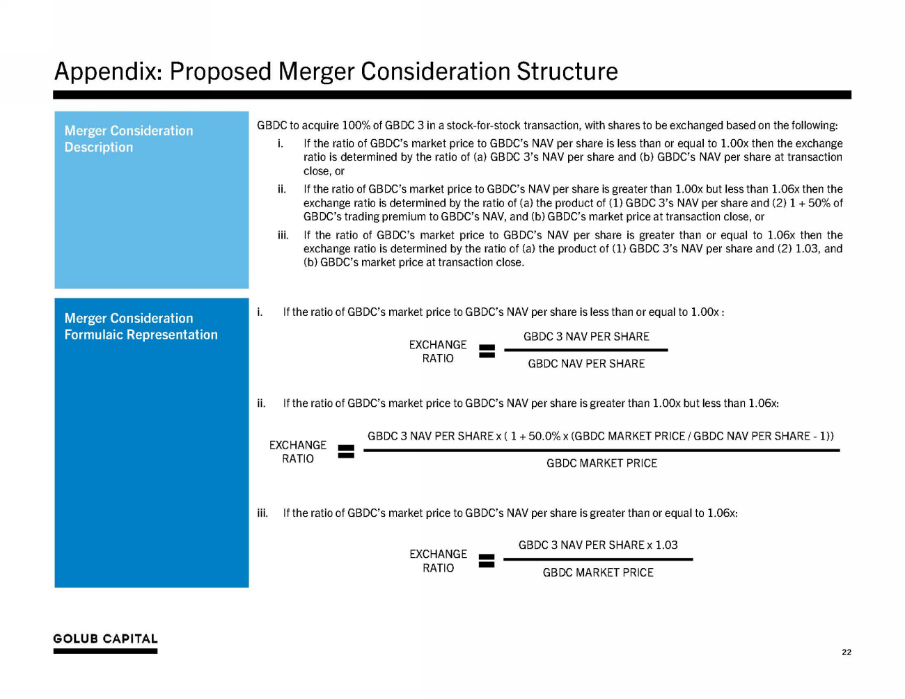 Appendix: Proposed Merger Consideration Structure GBDC to acquire 100% of GBDC 3 in a stock - for - stock transaction, with shares to be exchanged based on the following: iii. i. If the ratio of GBDC’s market price to GBDC’s NAV per share is less than or equal to 1 . 00 x then the exchange ratio is determined by the ratio of (a) GBDC 3 ’s NAV per share and (b) GBDC’s NAV per share at transaction close, or ii. If the ratio of GBDC’s market price to GBDC’s NAV per share is greater than 1 . 00 x but less than 1 . 06 x then the exchange ratio is determined by the ratio of (a) the product of ( 1 ) GBDC 3 ’s NAV per share and ( 2 ) 1 + 50 % of GBDC’s trading premium to GBDC’s NAV, and (b) GBDC’s market price at transaction close, or If the ratio of GBDC’s market price to GBDC’s NAV per share is greater than or equal to 1 . 06 x then the exchange ratio is determined by the ratio of (a) the product of ( 1 ) GBDC 3 ’s NAV per share and ( 2 ) 1 . 03 , and (b) GBDC’s market price at transaction close . Merger Consideration Description i. If the ratio of GBDC’s market price to GBDC’s NAV per share is less than or equal to 1.00x : ii. If the ratio of GBDC’s market price to GBDC’s NAV per share is greater than 1.00x but less than 1.06x: iii. If the ratio of GBDC’s market price to GBDC’s NAV per share is greater than or equal to 1.06x: Merger Consideration Formulaic Representation GBDC 3 NAV PER SHARE EX CH A NGE RATIO GBDC NAV PER SHARE GBDC 3 NAV PER SHARE x ( 1 + 50.0% x (GBDC MARKET PRICE / GBDC NAV PER SHARE - 1)) EX CH A NGE RATIO GBDC MARKET PRICE GBDC 3 NAV PER SHARE x 1.03 EX CH A NGE RATIO GBDC MARKET PRICE 22