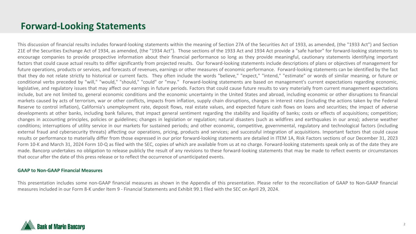 2 Text 95,96,96 Light Gray 232, 232, 232 Black 0, 0, 0 White 255, 255, 255 Accent 1 7,89,52 Accent 2 248,153,40 Accent 3 254,217,129 Accent 4 52,153,70 Accent 5 5,39,67 Accent 6 171,184,195 Forward-Looking Statements This discussion of financial results includes forward-looking statements within the meaning of Section 27A of the Securities Act of 1933, as amended, (the "1933 Act") and Section 21E of the Securities Exchange Act of 1934, as amended, (the "1934 Act"). Those sections of the 1933 Act and 1934 Act provide a "safe harbor" for forward-looking statements to encourage companies to provide prospective information about their financial performance so long as they provide meaningful, cautionary statements identifying important factors that could cause actual results to differ significantly from projected results. Our forward-looking statements include descriptions of plans or objectives of management for future operations, products or services, and forecasts of revenues, earnings or other measures of economic performance. Forward-looking statements can be identified by the fact that they do not relate strictly to historical or current facts. They often include the words "believe," "expect," "intend," "estimate" or words of similar meaning, or future or conditional verbs preceded by "will," "would," "should," "could" or "may." Forward-looking statements are based on management's current expectations regarding economic, legislative, and regulatory issues that may affect our earnings in future periods. Factors that could cause future results to vary materially from current management expectations include, but are not limited to, general economic conditions and the economic uncertainty in the United States and abroad, including economic or other disruptions to financial markets caused by acts of terrorism, war or other conflicts, impacts from inflation, supply chain disruptions, changes in interest rates (including the actions taken by the Federal Reserve to control inflation), California's unemployment rate, deposit flows, real estate values, and expected future cash flows on loans and securities; the impact of adverse developments at other banks, including bank failures, that impact general sentiment regarding the stability and liquidity of banks; costs or effects of acquisitions; competition; changes in accounting principles, policies or guidelines; changes in legislation or regulation; natural disasters (such as wildfires and earthquakes in our area); adverse weather conditions; interruptions of utility service in our markets for sustained periods; and other economic, competitive, governmental, regulatory and technological factors (including external fraud and cybersecurity threats) affecting our operations, pricing, products and services; and successful integration of acquisitions. Important factors that could cause results or performance to materially differ from those expressed in our prior forward-looking statements are detailed in ITEM 1A, Risk Factors sections of our December 31, 2023 Form 10-K and March 31, 2024 Form 10-Q as filed with the SEC, copies of which are available from us at no charge. Forward-looking statements speak only as of the date they are made. Bancorp undertakes no obligation to release publicly the result of any revisions to these forward-looking statements that may be made to reflect events or circumstances that occur after the date of this press release or to reflect the occurrence of unanticipated events. GAAP to Non-GAAP Financial Measures This presentation includes some non-GAAP financial measures as shown in the Appendix of this presentation. Please refer to the reconciliation of GAAP to Non-GAAP financial measures included in our Form 8-K under Item 9 - Financial Statements and Exhibit 99.1 filed with the SEC on April 29, 2024.