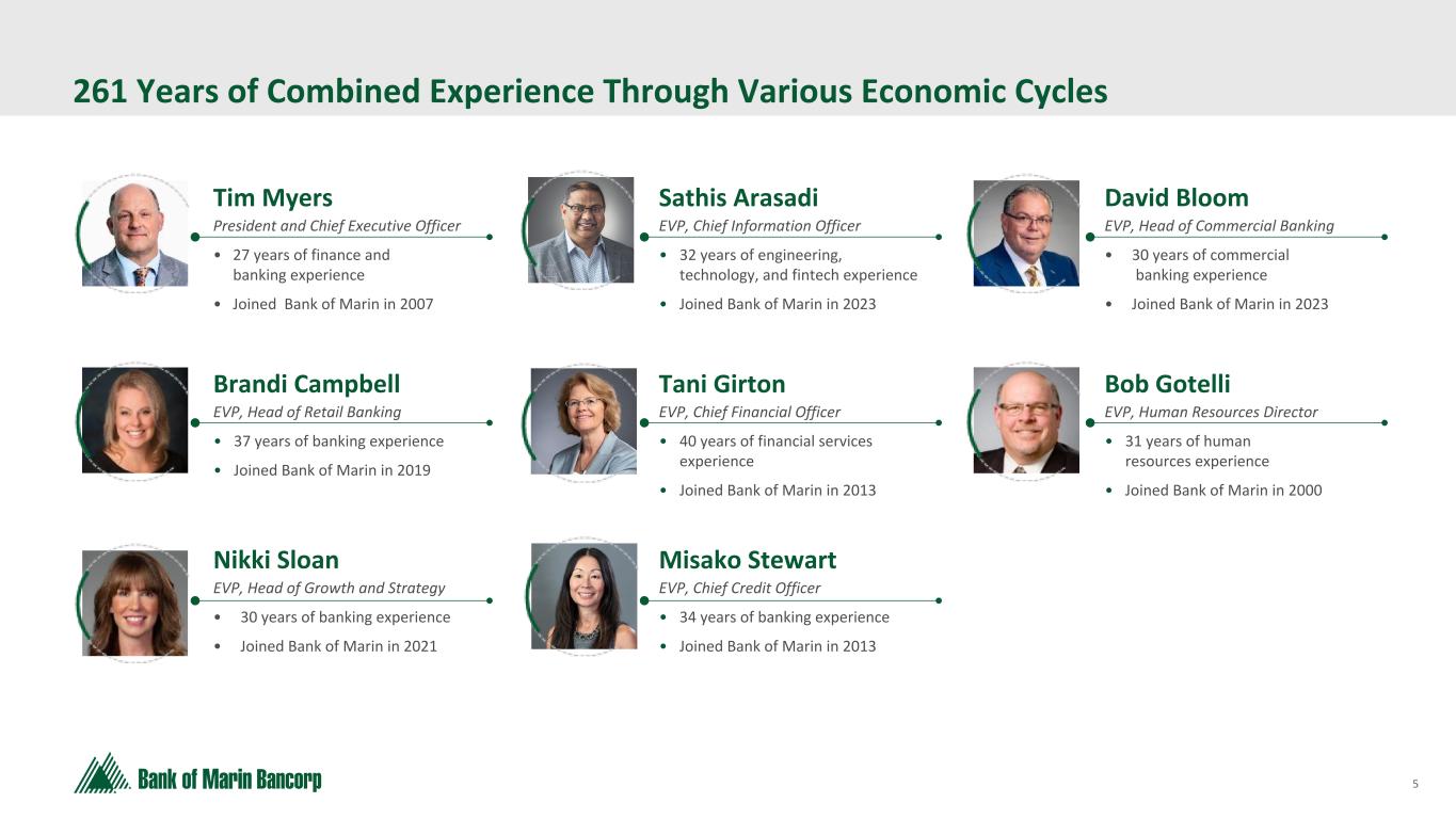 5 Text 95,96,96 Light Gray 232, 232, 232 Black 0, 0, 0 White 255, 255, 255 Accent 1 7,89,52 Accent 2 248,153,40 Accent 3 254,217,129 Accent 4 52,153,70 Accent 5 5,39,67 Accent 6 171,184,195 Bob Gotelli EVP, Human Resources Director • 31 years of human resources experience • Joined Bank of Marin in 2000 David Bloom EVP, Head of Commercial Banking • 30 years of commercial banking experience • Joined Bank of Marin in 2023 Tim Myers President and Chief Executive Officer • 27 years of finance and banking experience • Joined Bank of Marin in 2007 Nikki Sloan EVP, Head of Growth and Strategy • 30 years of banking experience • Joined Bank of Marin in 2021 Brandi Campbell EVP, Head of Retail Banking • 37 years of banking experience • Joined Bank of Marin in 2019 Sathis Arasadi EVP, Chief Information Officer • 32 years of engineering, technology, and fintech experience • Joined Bank of Marin in 2023 Tani Girton EVP, Chief Financial Officer • 40 years of financial services experience • Joined Bank of Marin in 2013 Misako Stewart EVP, Chief Credit Officer • 34 years of banking experience • Joined Bank of Marin in 2013 261 Years of Combined Experience Through Various Economic Cycles