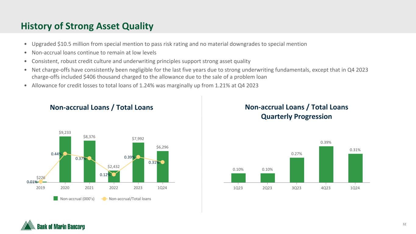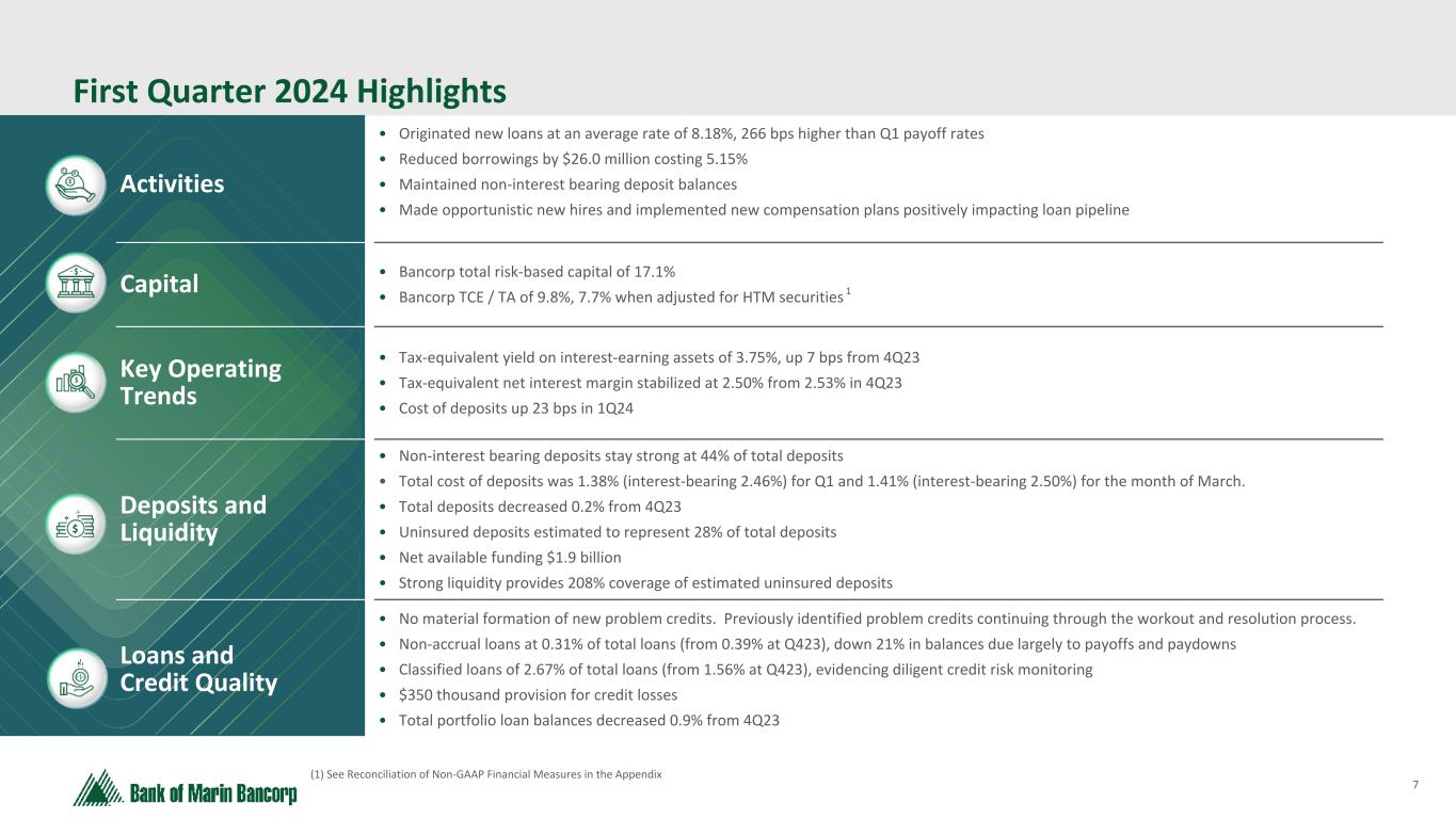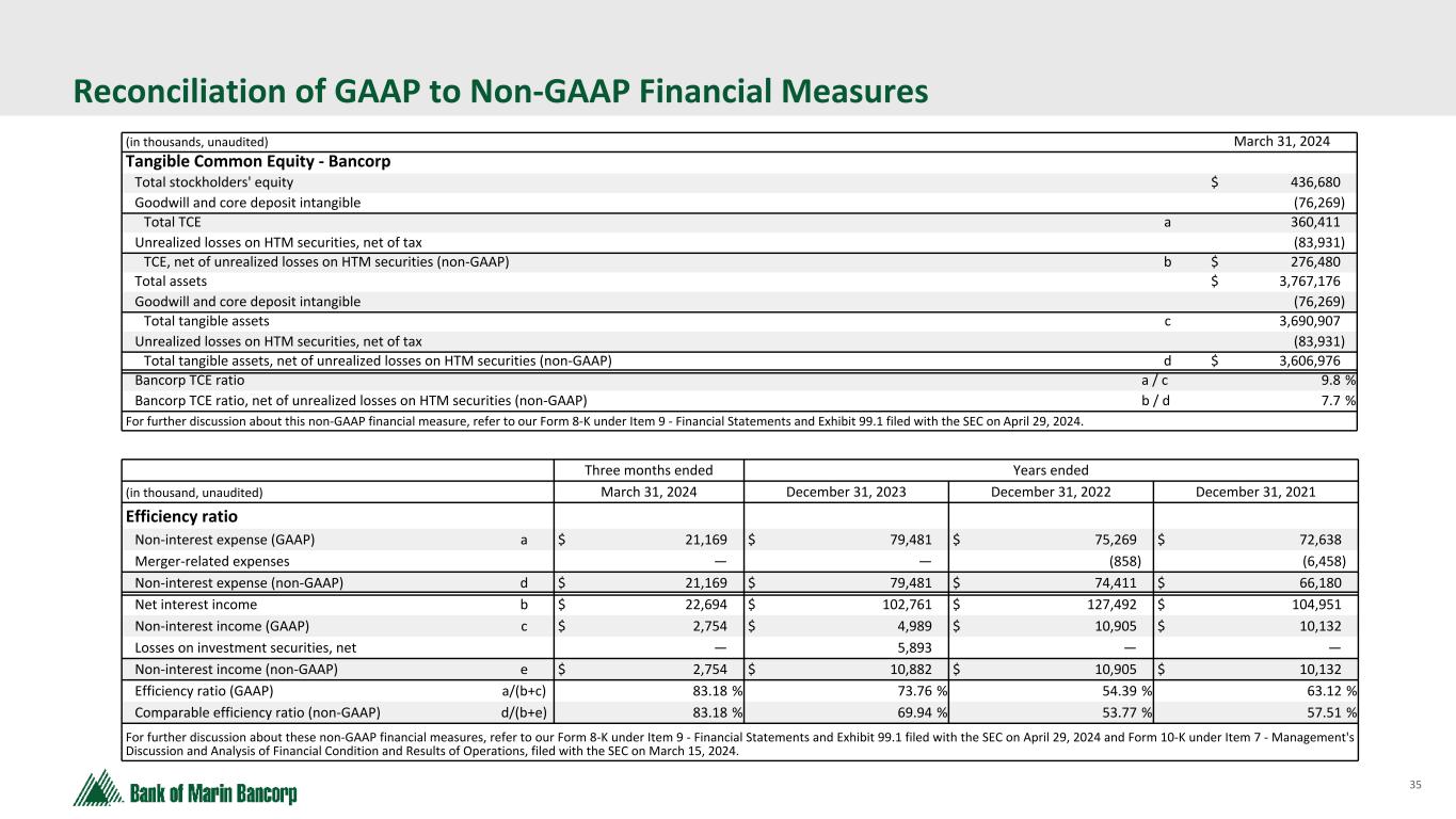 35 Text 95,96,96 Light Gray 232, 232, 232 Black 0, 0, 0 White 255, 255, 255 Accent 1 7,89,52 Accent 2 248,153,40 Accent 3 254,217,129 Accent 4 52,153,70 Accent 5 5,39,67 Accent 6 171,184,195 Reconciliation of GAAP to Non-GAAP Financial Measures (in thousands, unaudited) March 31, 2024 Tangible Common Equity - Bancorp Total stockholders' equity $ 436,680 Goodwill and core deposit intangible (76,269) Total TCE a 360,411 Unrealized losses on HTM securities, net of tax (83,931) TCE, net of unrealized losses on HTM securities (non-GAAP) b $ 276,480 Total assets $ 3,767,176 Goodwill and core deposit intangible (76,269) Total tangible assets c 3,690,907 Unrealized losses on HTM securities, net of tax (83,931) Total tangible assets, net of unrealized losses on HTM securities (non-GAAP) d $ 3,606,976 Bancorp TCE ratio a / c 9.8 % Bancorp TCE ratio, net of unrealized losses on HTM securities (non-GAAP) b / d 7.7 % For further discussion about this non-GAAP financial measure, refer to our Form 8-K under Item 9 - Financial Statements and Exhibit 99.1 filed with the SEC on April 29, 2024. Three months ended Years ended (in thousand, unaudited) March 31, 2024 December 31, 2023 December 31, 2022 December 31, 2021 Efficiency ratio Non-interest expense (GAAP) a $ 21,169 $ 79,481 $ 75,269 $ 72,638 Merger-related expenses — — (858) (6,458) Non-interest expense (non-GAAP) d $ 21,169 $ 79,481 $ 74,411 $ 66,180 Net interest income b $ 22,694 $ 102,761 $ 127,492 $ 104,951 Non-interest income (GAAP) c $ 2,754 $ 4,989 $ 10,905 $ 10,132 Losses on investment securities, net — 5,893 — — Non-interest income (non-GAAP) e $ 2,754 $ 10,882 $ 10,905 $ 10,132 Efficiency ratio (GAAP) a/(b+c) 83.18 % 73.76 % 54.39 % 63.12 % Comparable efficiency ratio (non-GAAP) d/(b+e) 83.18 % 69.94 % 53.77 % 57.51 % For further discussion about these non-GAAP financial measures, refer to our Form 8-K under Item 9 - Financial Statements and Exhibit 99.1 filed with the SEC on April 29, 2024 and Form 10-K under Item 7 - Management's Discussion and Analysis of Financial Condition and Results of Operations, filed with the SEC on March 15, 2024.