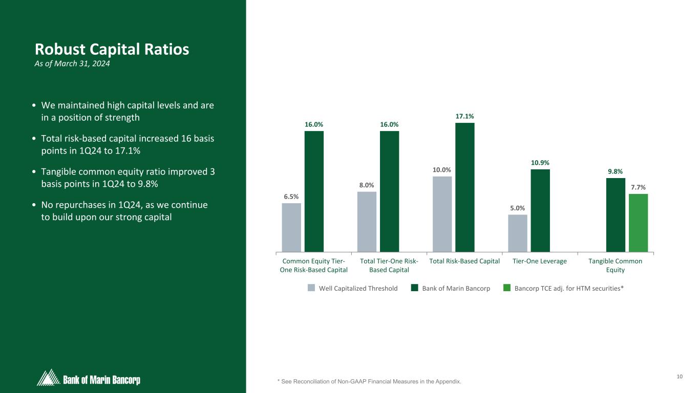 9 Text 95,96,96 Light Gray 232, 232, 232 Black 0, 0, 0 White 255, 255, 255 Accent 1 7,89,52 Accent 2 248,153,40 Accent 3 254,217,129 Accent 4 52,153,70 Accent 5 5,39,67 Accent 6 171,184,195 Focused on delivering Long-Term, Consistent Growth • Proven ability to grow both organically and through M&A • Consistent cash dividend provides stable and reliable return for shareholders Note: Tangible book value per share (TBVPS) equals total shareholders’ equity, less intangible assets including goodwill and core deposit intangibles, divided by outstanding common shares at period end. Accumulated other comprehensive income (AOCI) represents the unrealized gains (losses) on available-for-sale securities, net of tax. Components of these calculations were derived from our financial reports filed with the SEC for each respective period. Additional information for Q1 2024 can be found in the Reconciliation of Non-GAAP Financial Measures in the Appendix. Tangible Book Value Per Share and Cumulative Cash Dividends $0.37 $0.77 $1.22 $1.73 $2.29 $2.92 $3.72 $4.64 $5.58 $6.56 $7.56 $7.81 $14.51 $15.89 $16.87 $18.35 $18.99 $20.57 $21.91 $23.09 $23.42 $25.45 $25.72 $25.51 Cumulative Cash Dividends TBVPS TBVPS (Excl AOCI) 2013 2014 2015 2016 2017 2018 2019 2020 2021 2022 2023 1Q24 $— $5.00 $10.00 $15.00 $20.00 $25.00 $30.00