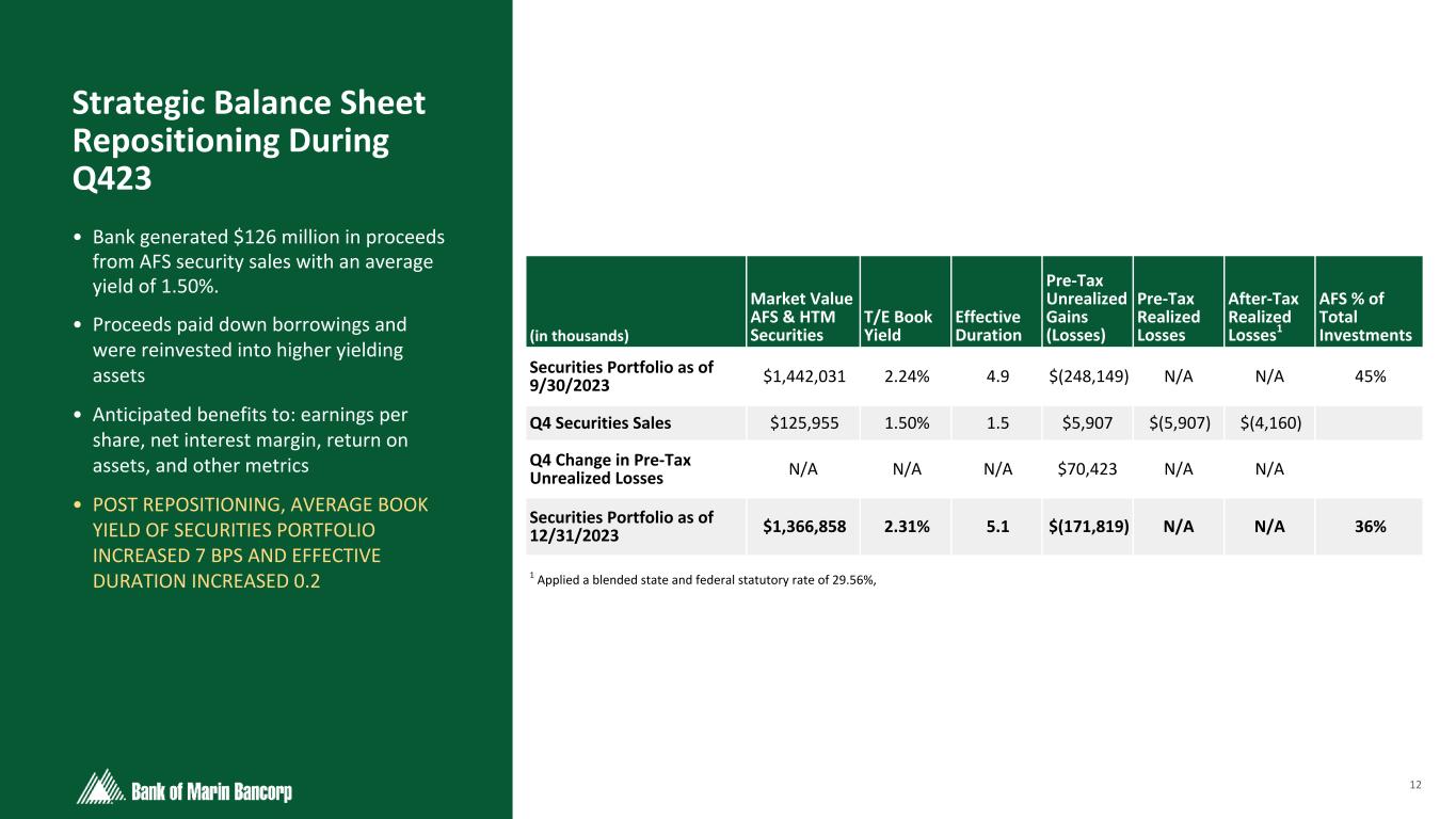 12 Text 95,96,96 Light Gray 232, 232, 232 Black 0, 0, 0 White 255, 255, 255 Accent 1 7,89,52 Accent 2 248,153,40 Accent 3 254,217,129 Accent 4 52,153,70 Accent 5 5,39,67 Accent 6 171,184,195 Strategic Balance Sheet Repositioning During Q423 • Bank generated $126 million in proceeds from AFS security sales with an average yield of 1.50%. • Proceeds paid down borrowings and were reinvested into higher yielding assets • Anticipated benefits to: earnings per share, net interest margin, return on assets, and other metrics • POST REPOSITIONING, AVERAGE BOOK YIELD OF SECURITIES PORTFOLIO INCREASED 7 BPS AND EFFECTIVE DURATION INCREASED 0.2 (in thousands) Market Value AFS & HTM Securities T/E Book Yield Effective Duration Pre-Tax Unrealized Gains (Losses) Pre-Tax Realized Losses After-Tax Realized Losses1 AFS % of Total Investments Securities Portfolio as of 9/30/2023 $1,442,031 2.24% 4.9 $(248,149) N/A N/A 45% Q4 Securities Sales $125,955 1.50% 1.5 $5,907 $(5,907) $(4,160) Q4 Change in Pre-Tax Unrealized Losses N/A N/A N/A $70,423 N/A N/A Securities Portfolio as of 12/31/2023 $1,366,858 2.31% 5.1 $(171,819) N/A N/A 36% 1 Applied a blended state and federal statutory rate of 29.56%,
