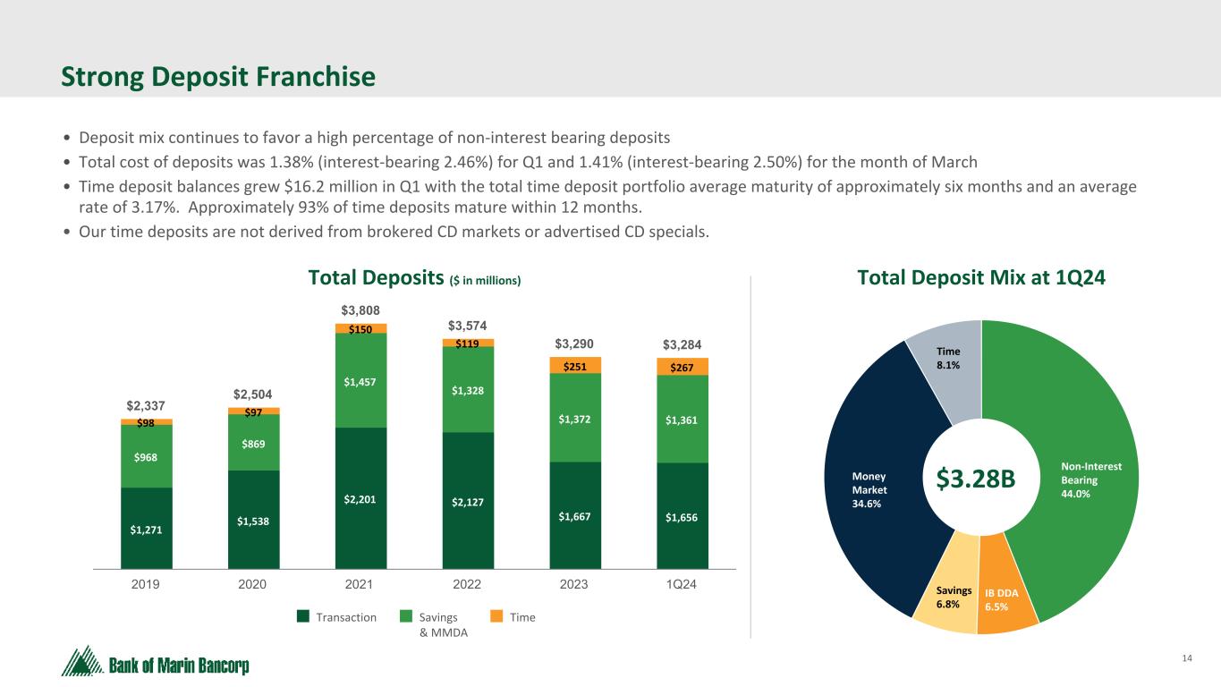 13 Text 95,96,96 Light Gray 232, 232, 232 Black 0, 0, 0 White 255, 255, 255 Accent 1 7,89,52 Accent 2 248,153,40 Accent 3 254,217,129 Accent 4 52,153,70 Accent 5 5,39,67 Accent 6 171,184,195 1 Taxable equivalent. 2 See Reconciliation of Non-GAAP Financial Measures in the Appendix High-Quality Securities Portfolio Generates Cash Flow Data as of 3/31/24 AFS Securities Portfolio Agency MBS/CMO 64% GSEs 12% Municipal Bonds 17% SBA 3% Corporate Bonds & Other 2% USTs 2% ($ in millions at Fair Value) $536.4MM HTM Securities Portfolio Agency MBS/CMO 74% GSEs 16% Municipal Bonds 7% Corporate Bonds 3% $915.1MM ($ in millions at Cost) Average Yield1 — 2.05% Approx. Effective Duration — 4.41 Unrealized Losses (after tax) — $46.5 million TCE Bancorp — 9.8% Average Yield — 2.48% Approx. Effective Duration — 5.66 Unrealized Losses (after tax) — $83.9 million TCE Bancorp w/ HTM — 7.7% 2